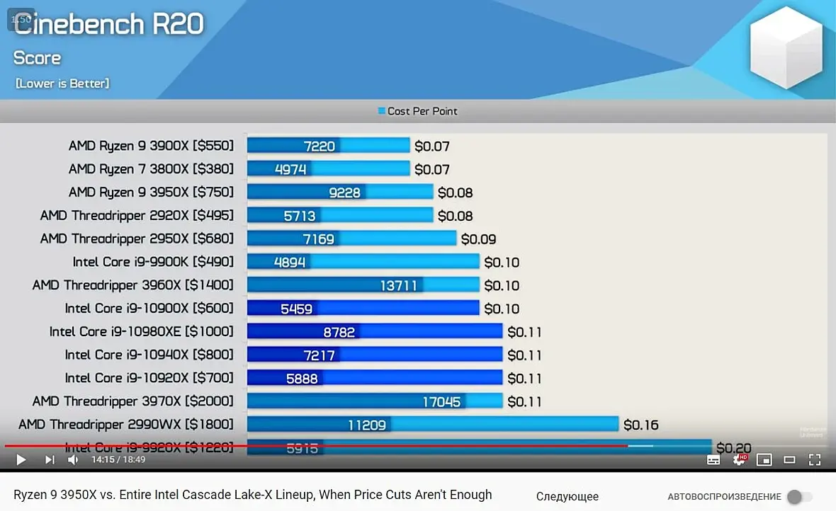 grdesigner, да так. Цифры как цифры. Земля бетоном Интелу... Но я бы конечно всерьез уже CBR15 не воспринимал. Все же слишком короткая дистанция бенчмарка для таких процов.