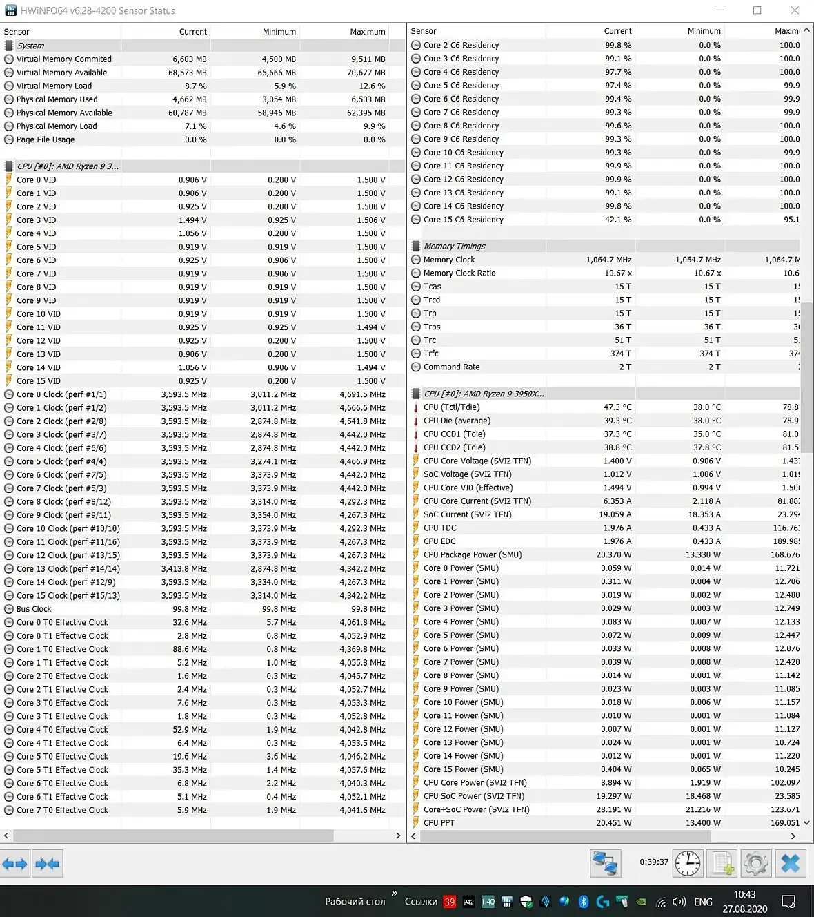 CPU Ryzen 9 3900X; плата Gigabyte X570 Aorus Elite; кулер: Noctua NH-D15; память Crucial Ballistix Sport LT 3200 64Gb в разгоне до 3600 16-19-16-36.