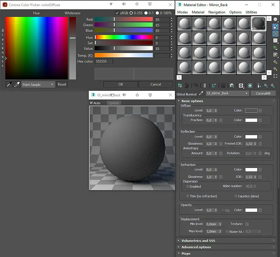 Можно попробовать сфейковать. У зеркала невидимого напрямую в камере (только через отражения) уменьшить рефлекшн (сделать его чуть тукслее). Тут только на вкус и цвет. Я с Vray подобным образом не экспериментировал, но по идеи должно работать также как и в Corona. У фронтального зеркала можно GI светлее сделать: