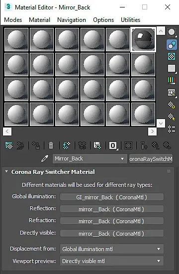 Можно попробовать сфейковать. У зеркала невидимого напрямую в камере (только через отражения) уменьшить рефлекшн (сделать его чуть тукслее). Тут только на вкус и цвет. Я с Vray подобным образом не экспериментировал, но по идеи должно работать также как и в Corona. У фронтального зеркала можно GI светлее сделать: