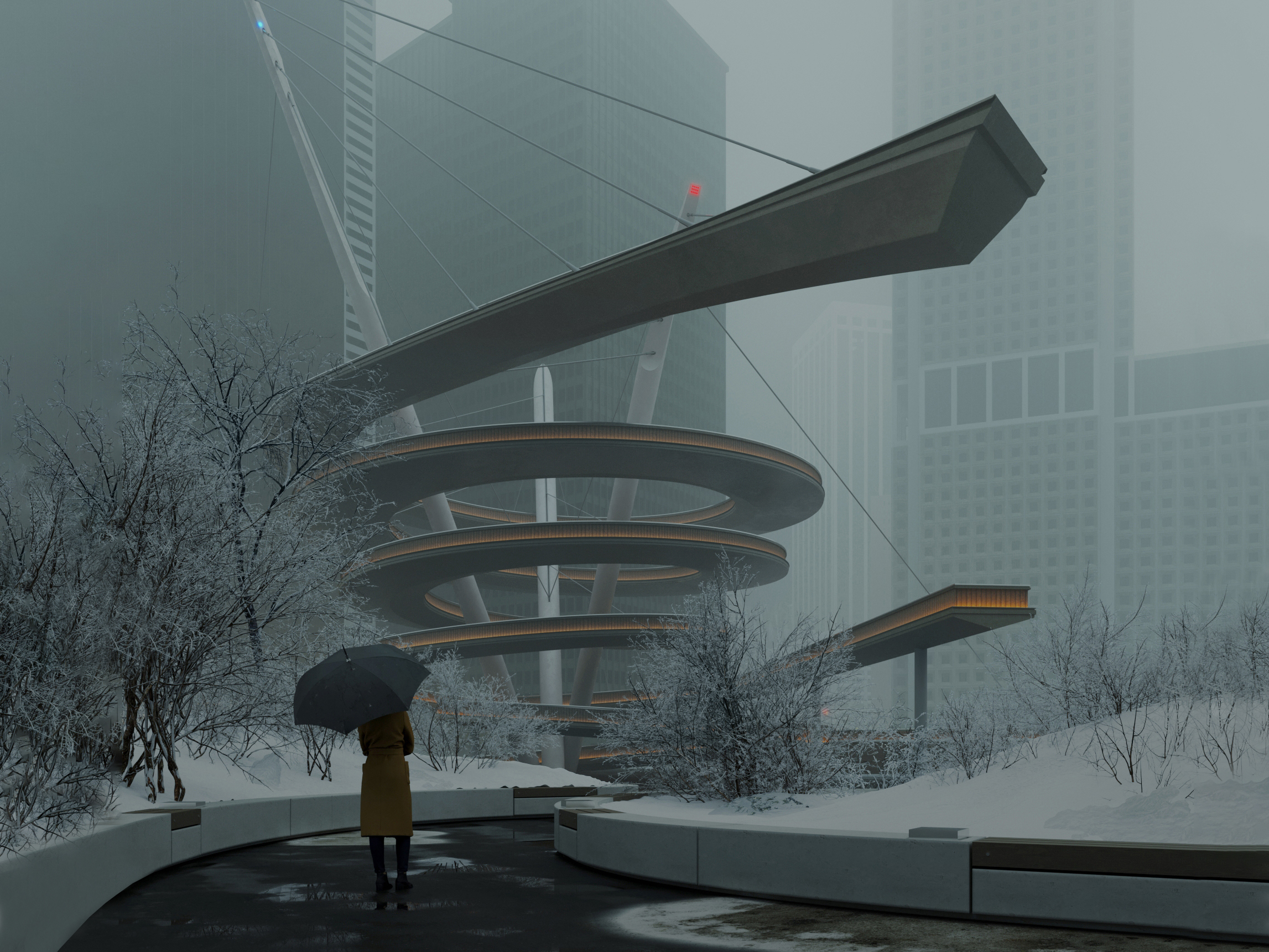 Спираль по сути может предполагать организацию более обширного пространства, чем быть единичным элементом "сам по себе. К примеру, было бы неплохо связать "змея" с каким-нибудь объектом, "обвить его хотя бы полуокружностью, дугой или более конкретно "связать" архитектурное поле.
