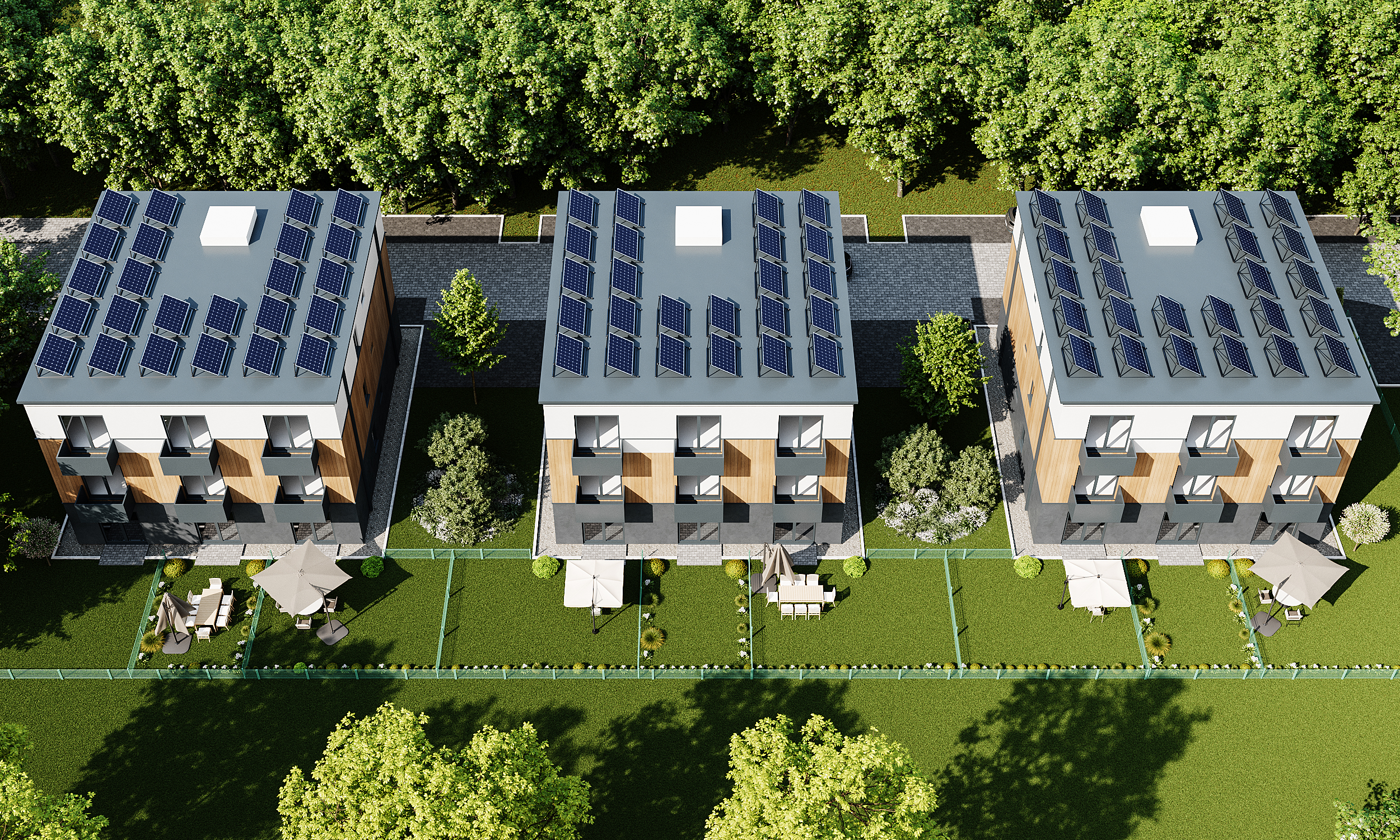 This visualization of a three-story communal residential building designed for 9 households was created for villages in Germany. The main goal of the project is to create a modern and comfortable living environment. Natural materials were used in the facade, harmonizing the building with the surrounding landscape.