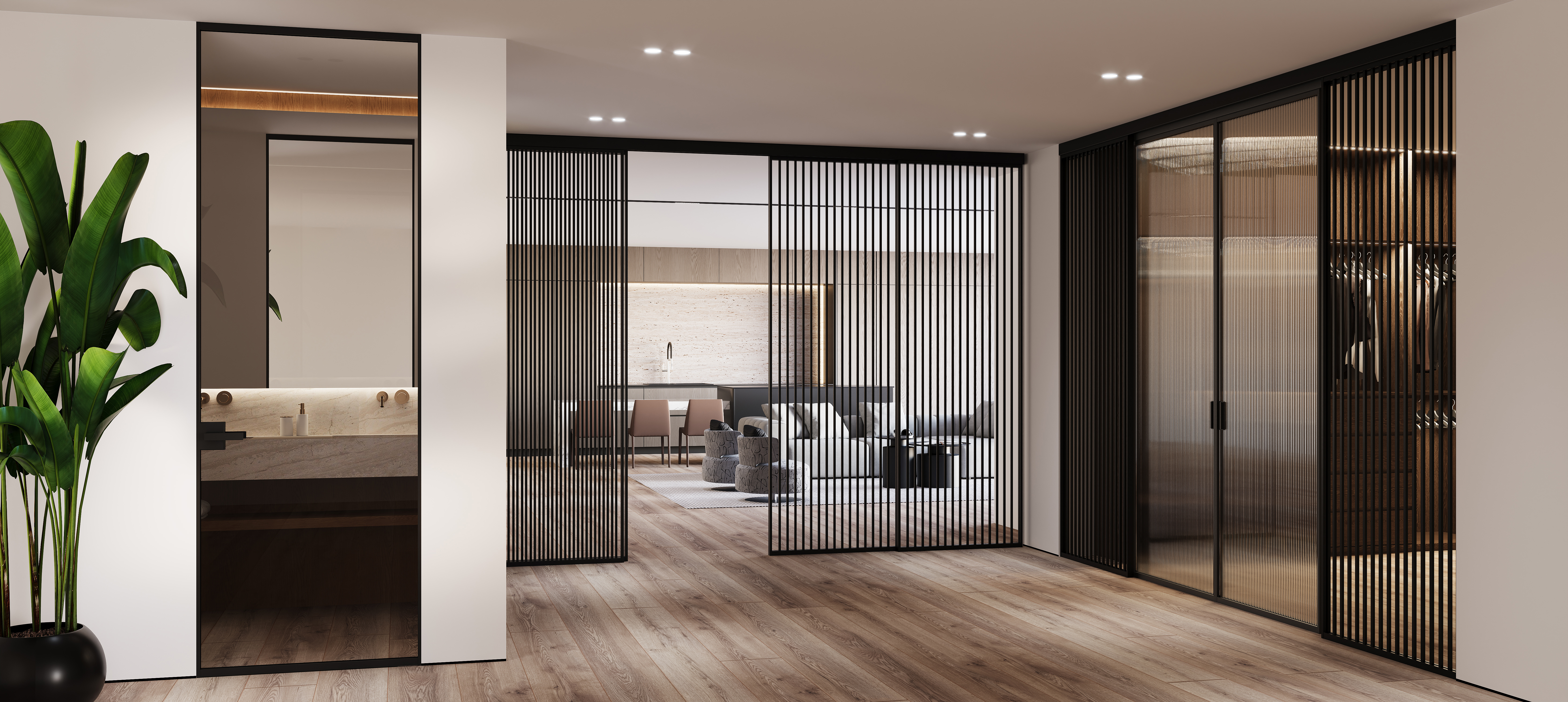 Раздвижные алюминиевые перегородки - это не только современное решение, но и удобное зонирование, большое количество освещения и экономия пространства.
