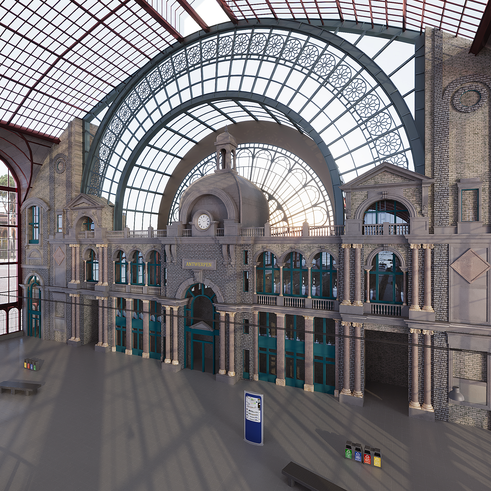 Фотореалистичная 3D-модель вокзала в стиле Антверпен-Сентрал, выполненная с высокой точностью и вниманием к архитектурным деталям. Идеально подходит для визуализаций, анимаций и городских сцен в премиум-уровне проектов.