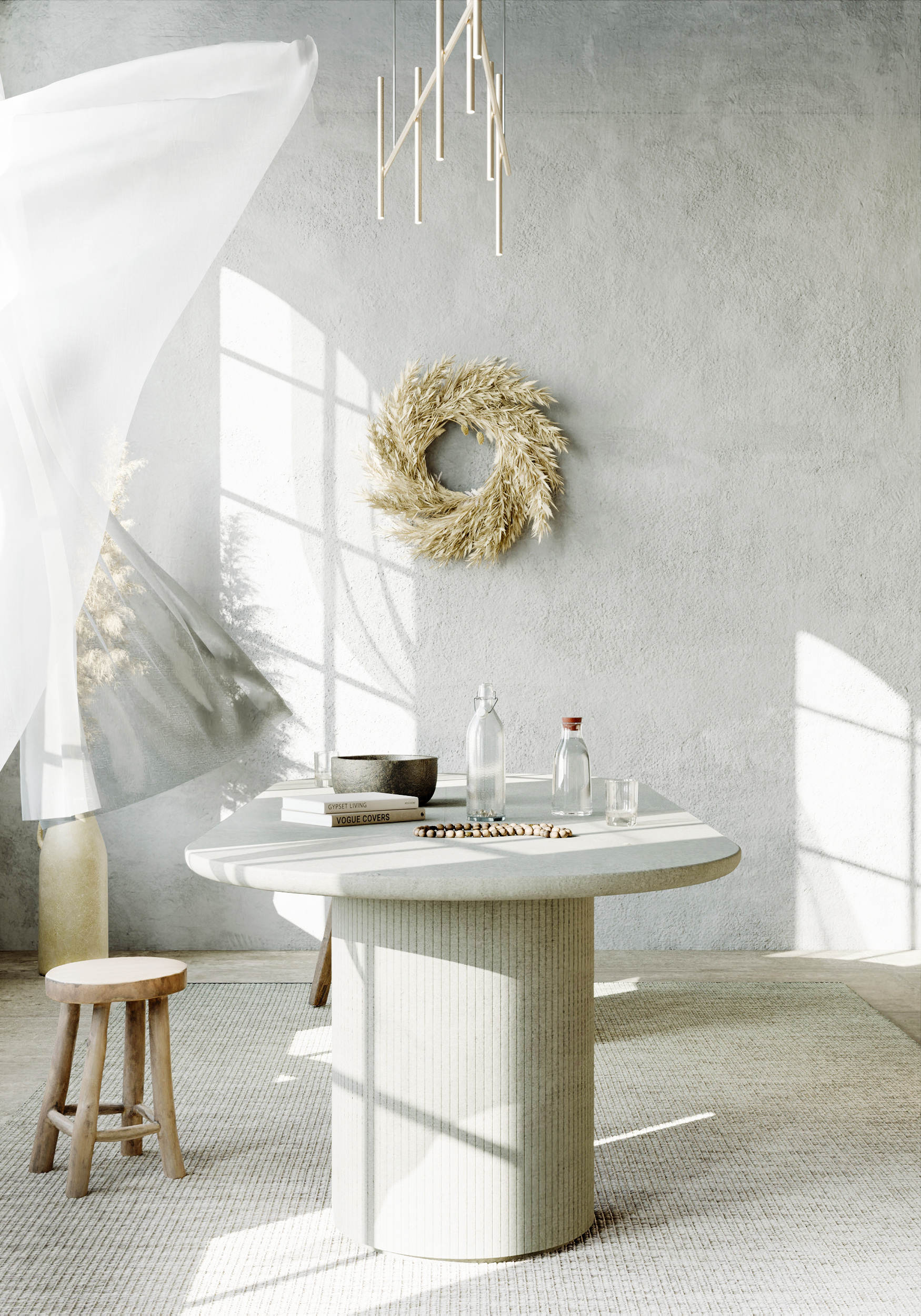 В основу концепции дизайна взята эстетика аутентичного минимализма, поэтому выбор материалов был сделан в пользу необработанного дерева, камня, глиняных изделий, металла и стекла. Акценты были сделаны на сочетании неровности грубых поверхностей с прямыми линиями современных дизайн фурнитур.