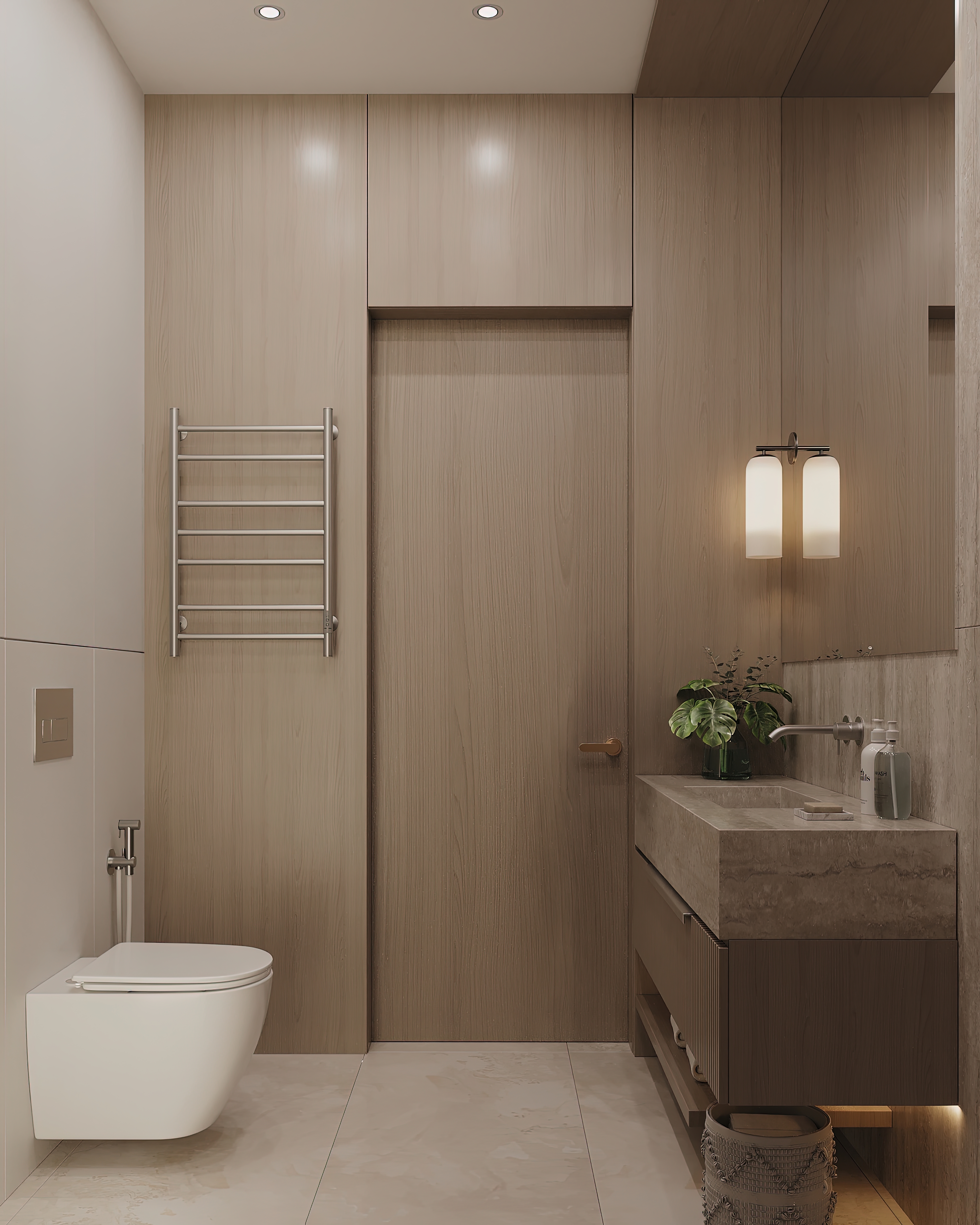 This interior conveys a calm clean and refined vibe through warm minimal tones natural stone and wood textures soft lighting and clean lines creating a spa like atmosphere balanced with modern elegance and quiet comfort.