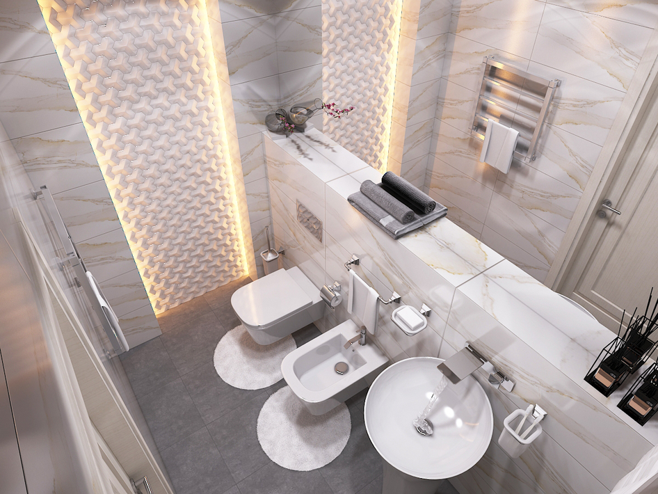 Просчет бликов на объемной плитке ужатный (черная обводка). Катмул рум? Ну и контраста больше хочется, серовато. Хотя одновременно темные зоны провалены. Наверное в данном случае обработка по маскам просто необходима. Диз симпотный, я тоже как-то делала диз с Порселанозой, сейчас строится, очень жду завершения, чтоб в живую глянуть. Ну и белая плитка с прожилками под мрамор - везде одинаковая текстура, хоть и повернута в разные стороны. Надо хотя бы три текстурки, чтоб не тайлилось.