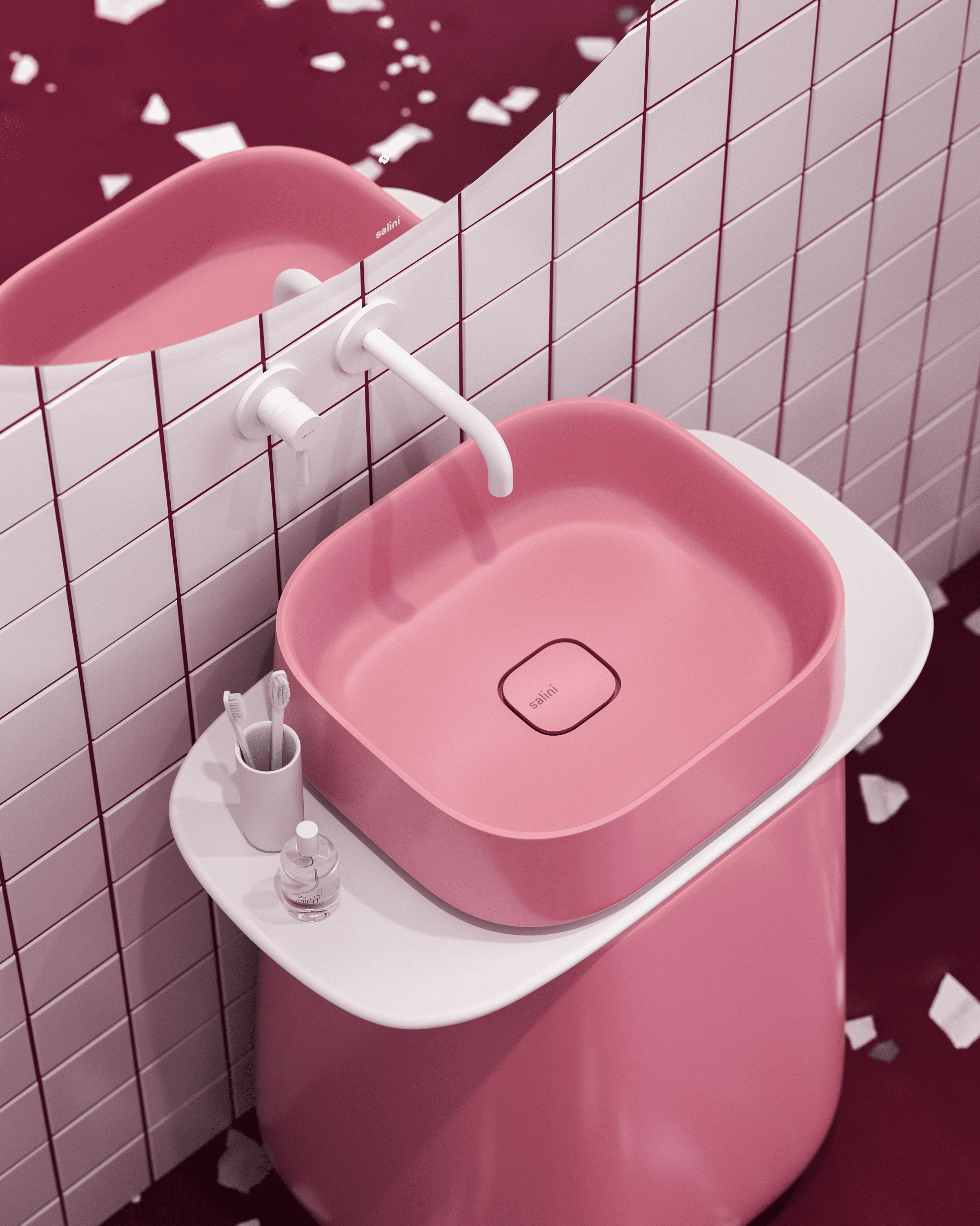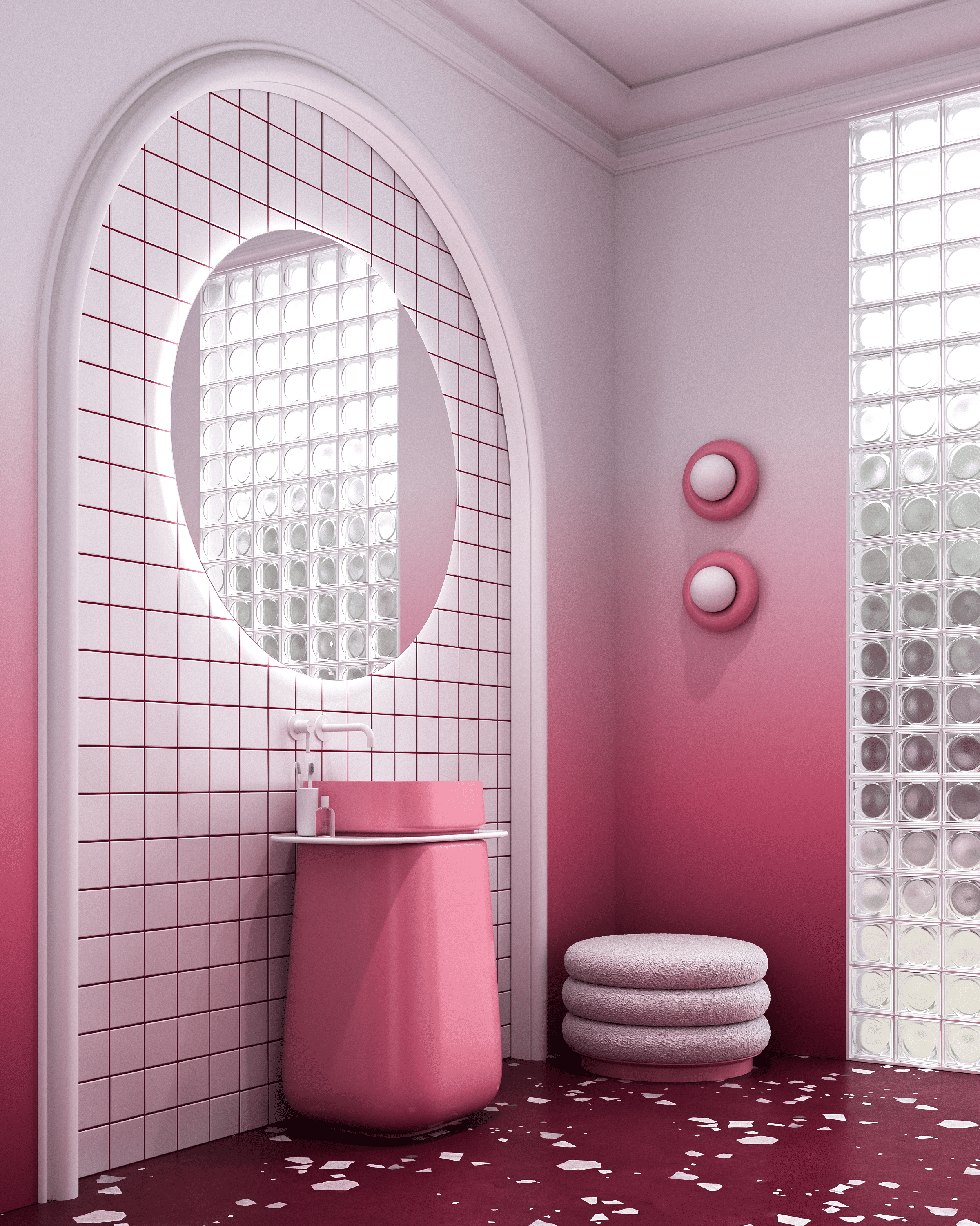 Этот интерьер для конкурса производителя сантехники воплощает образ изысканного ягодного десерта. Пространство построено на мягком градиенте — от насыщенного брусничного пола к воздушно-белым стенам. Центральным элементом выступает скульптурная белая ванна, ассиметричная форма которой напоминает пики взбитых сливок. Её дополняет нежно-розовая раковина, похожая на сочную ягоду в облаке безе.