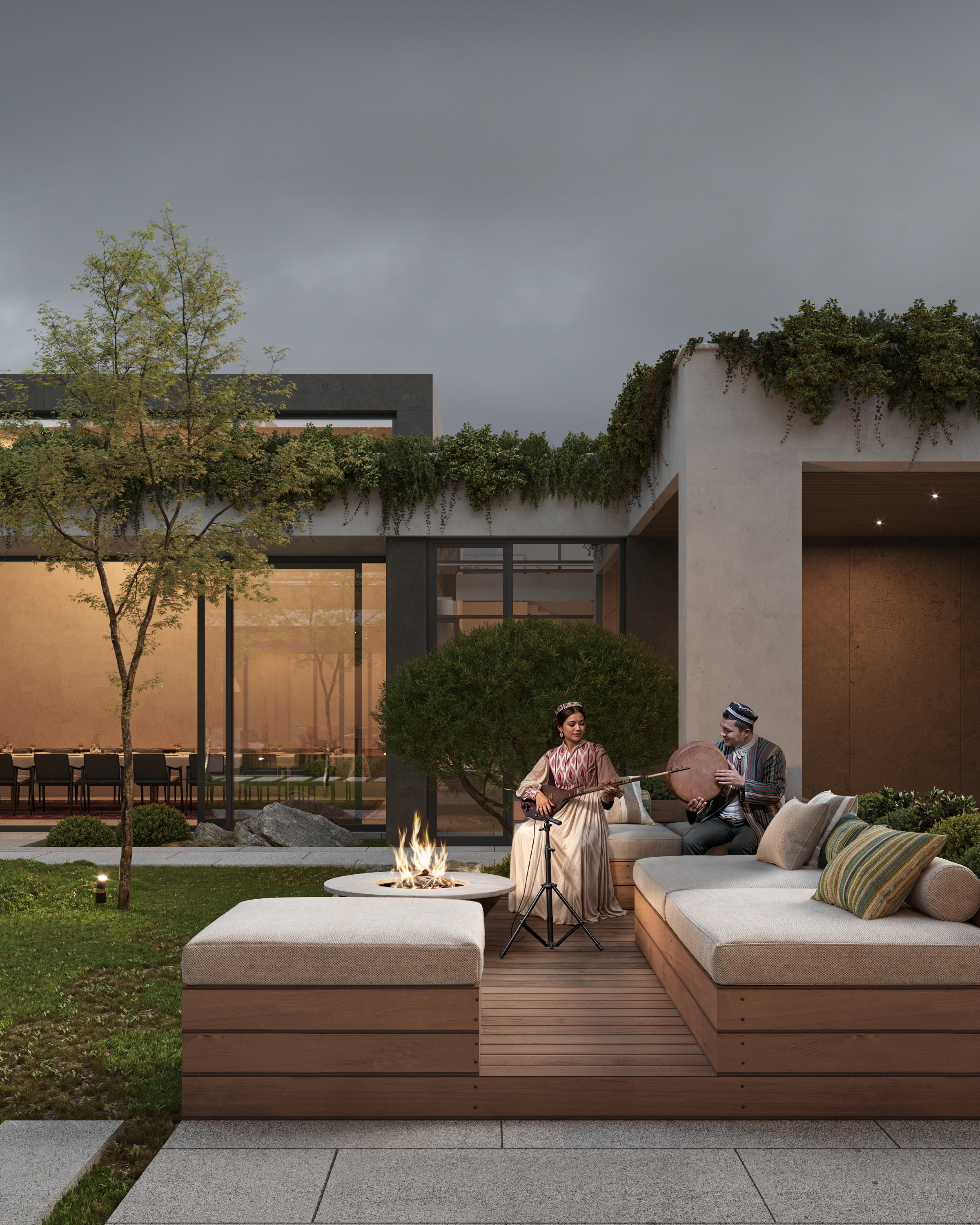 Проект создаёт комфортный баланс между открытым двором и внутренними пространствами.