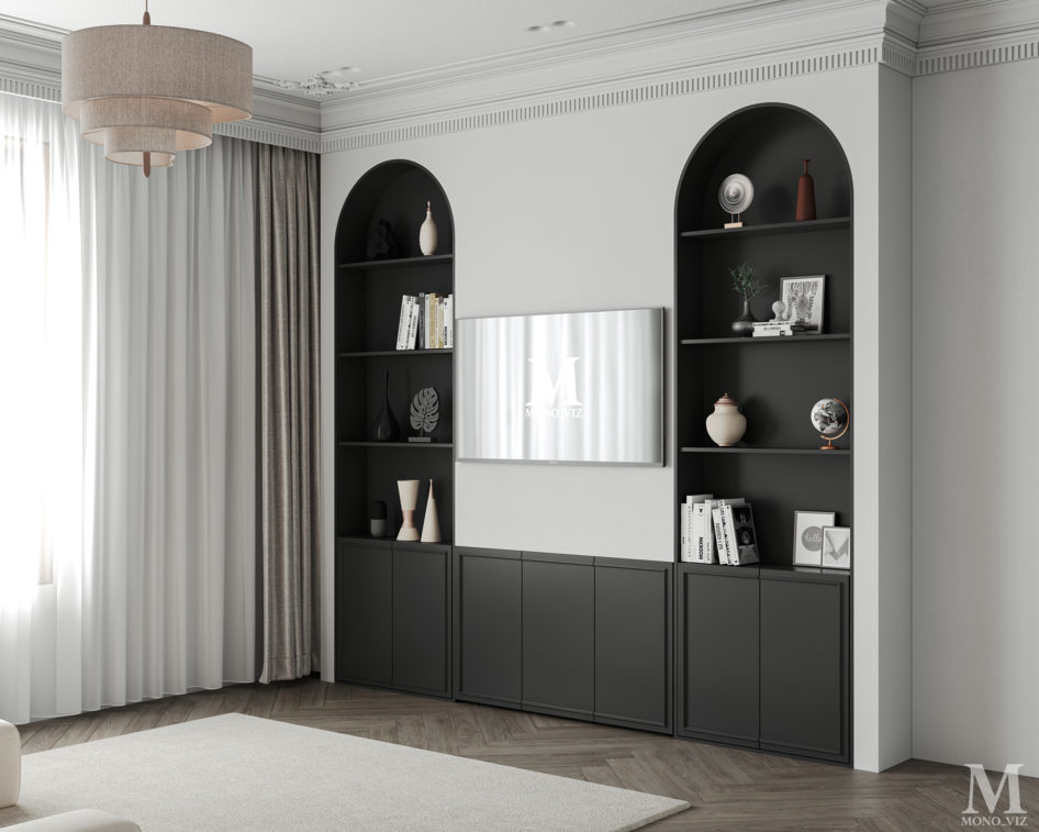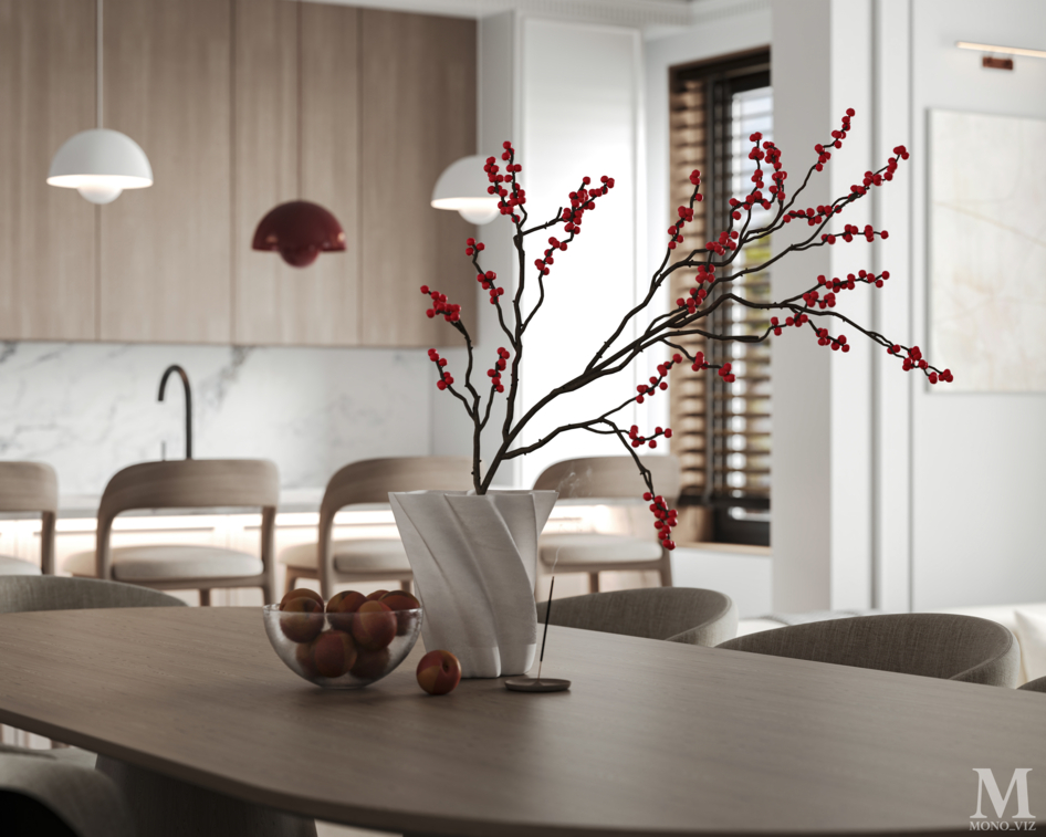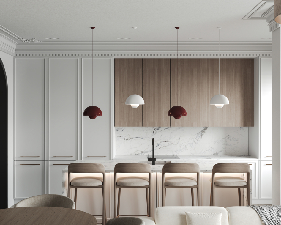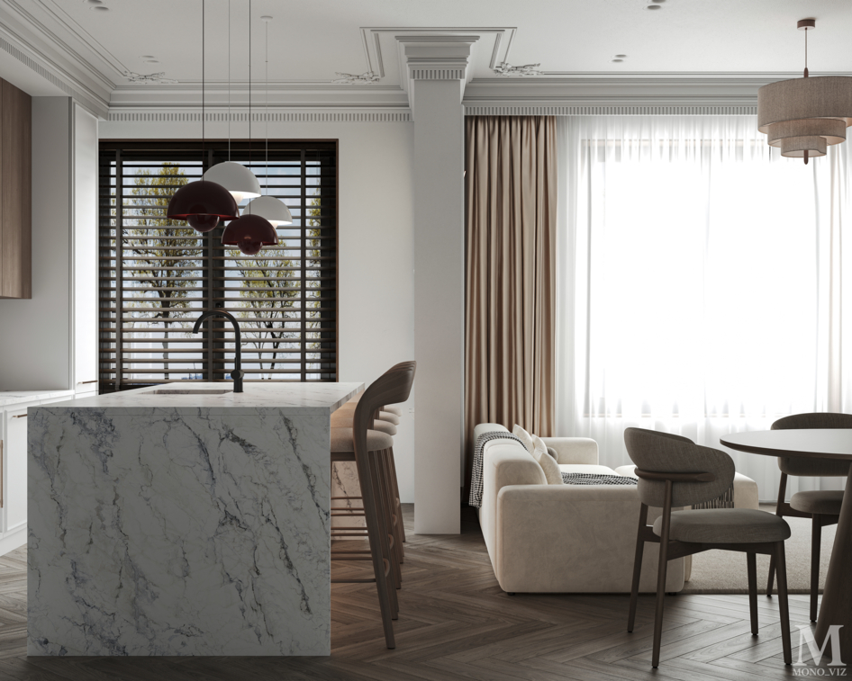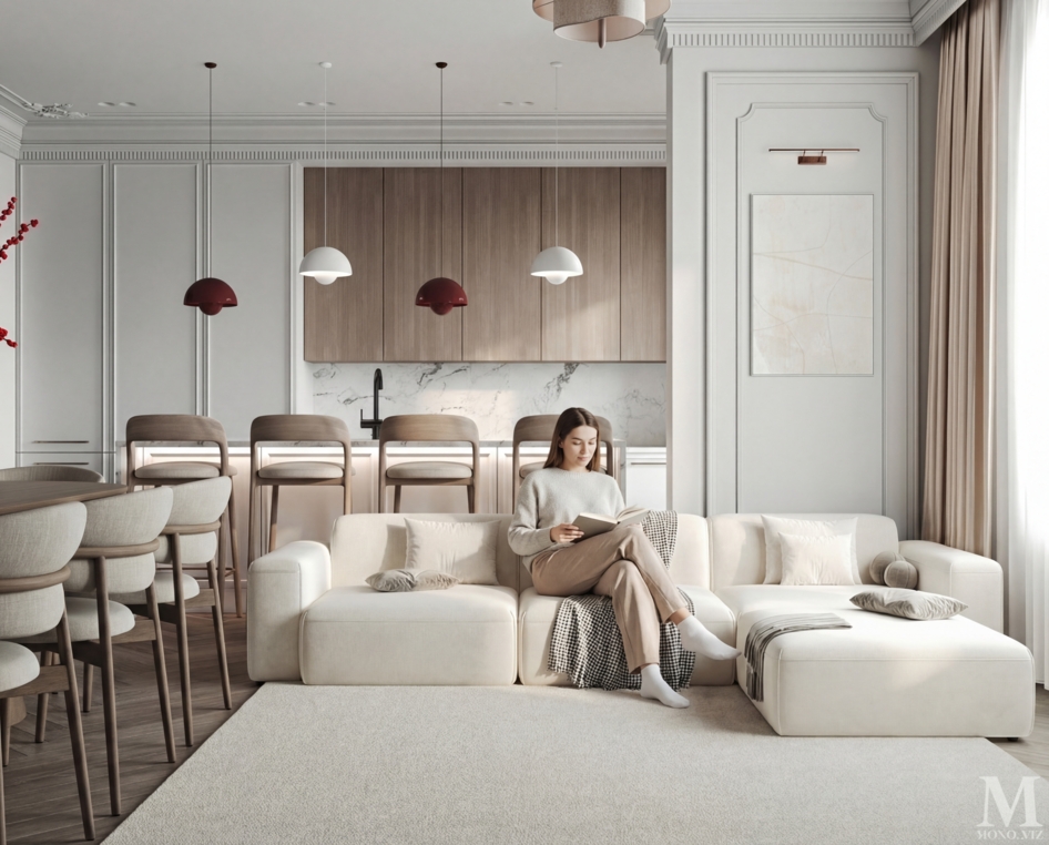 Bright open-plan living room and kitchen in a modern style, featuring a cream sofa, wooden cabinetry, a marble backsplash, and soft natural daylight creating a warm, elegant atmosphere.