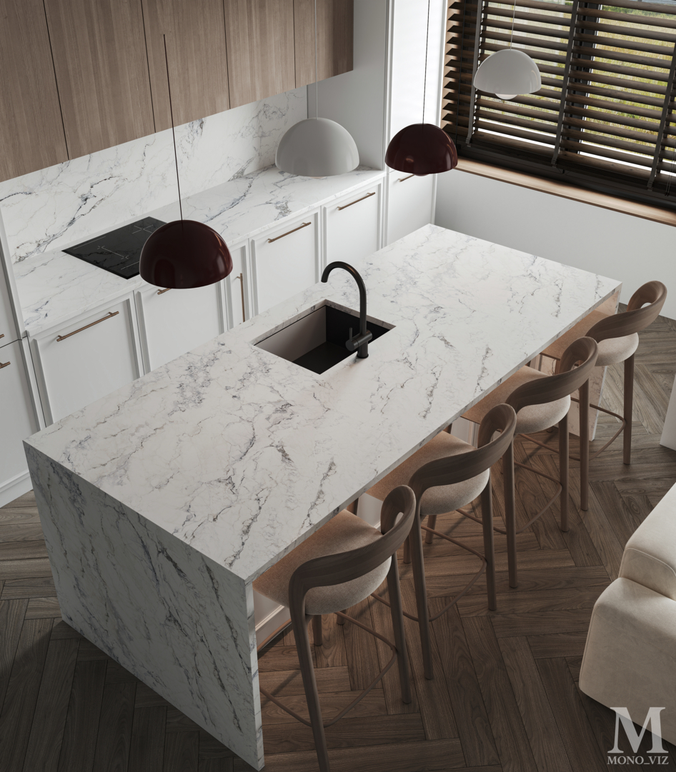одна из самых распространенных ошибок в визуализациях) по эргономике расстояние между столешницей и сиденьем около 30 см. и если обеденные столы и стулья производятся и - соответственно - моделируются как правило стандартной высоты, и визуализаторы ставят их в сцену не заморачиваясь, то высота барной стойки сильно колеблется, да и барных стульев тоже. и вот тут начинается веселье)