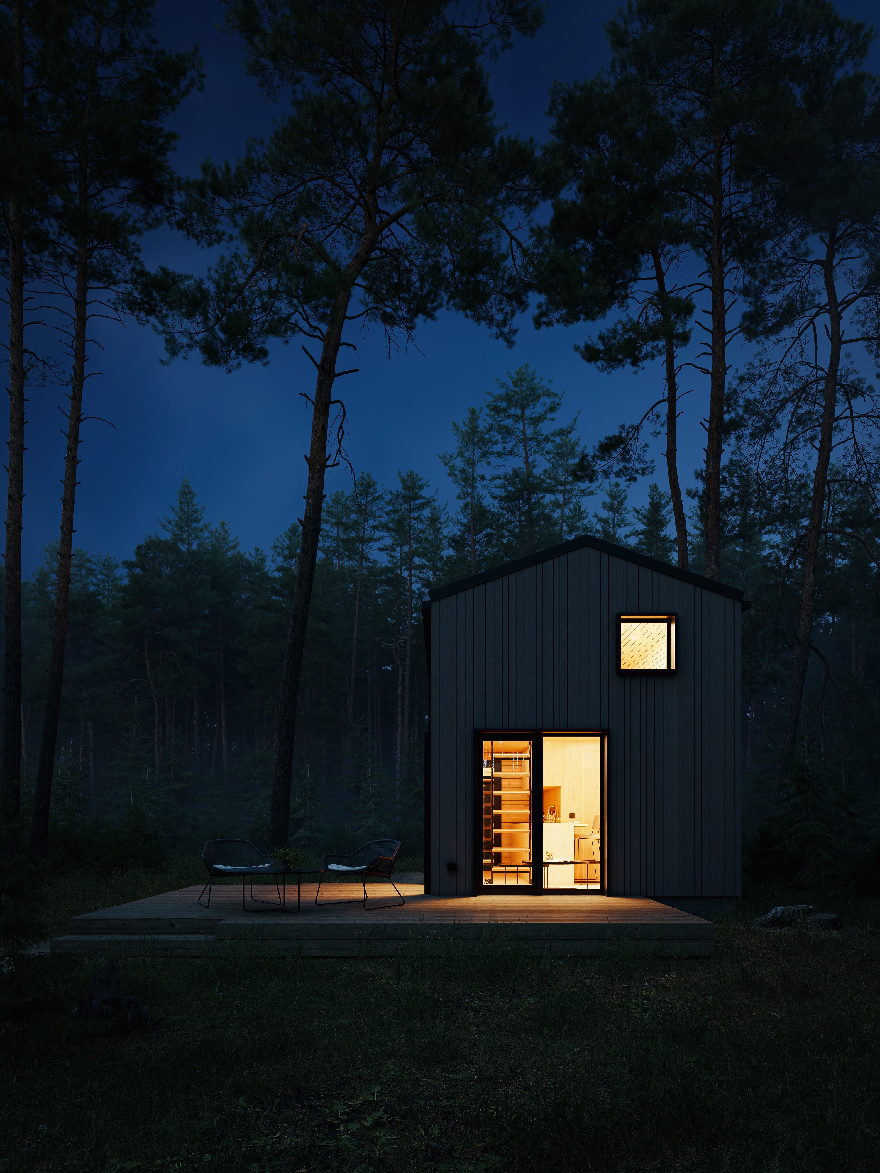 Tiny House Visual: Andrew Bystrykh Soft: Archicad | Blender 4.2 | Cycles render Year: 2025 Визуализация маленького домика в сосновом лесу. Для дневного освещения использовались HDRI+Sun, для ночного только HDRI. Озеленение в сцене выполнено с помощью аддона GeoScatter. Behance: