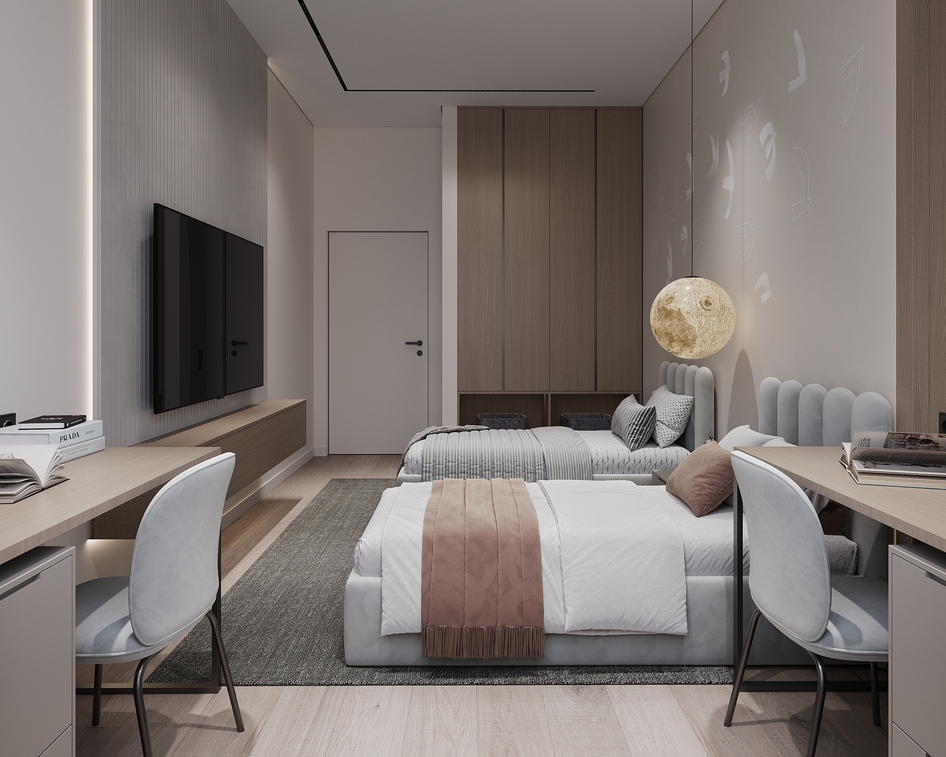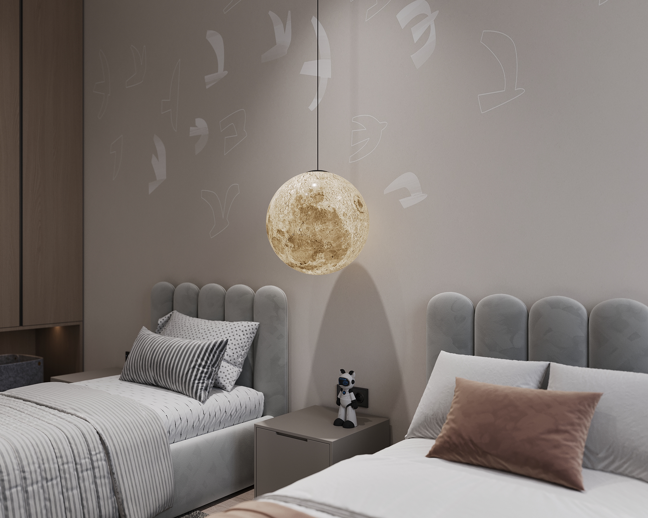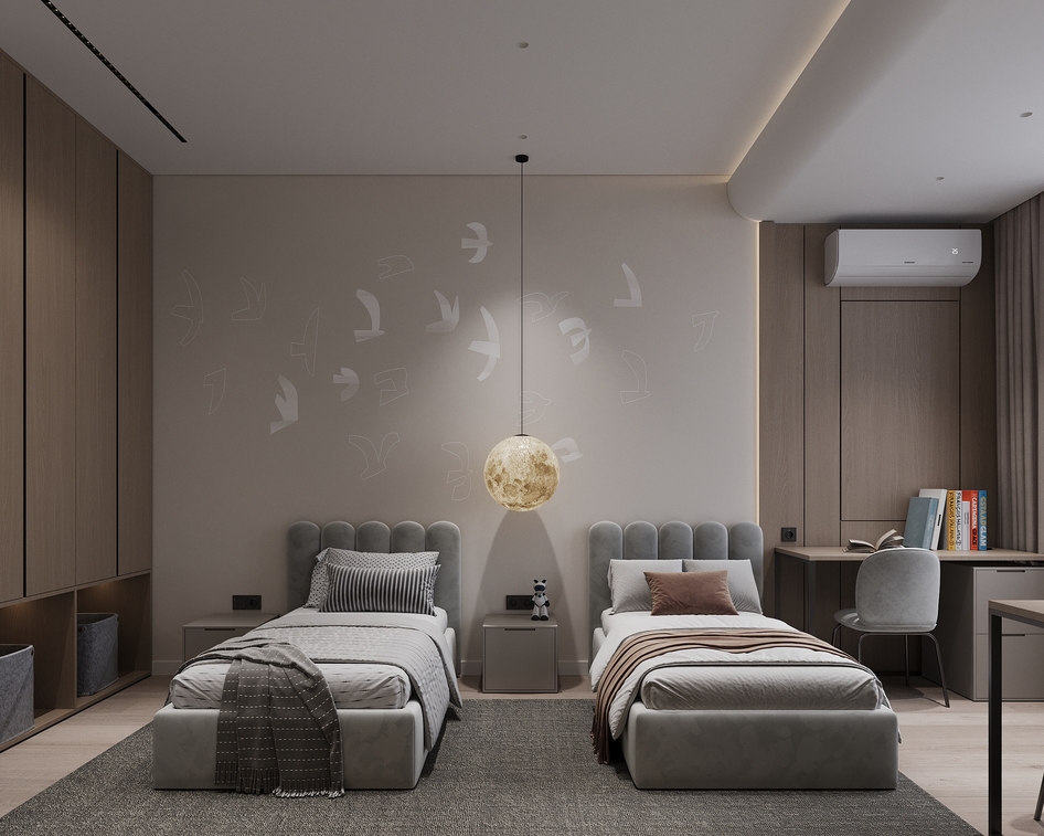 "Лунный уют: современная детская с мягкими тонами, волшебным освещением и атмосферой спокойствия."