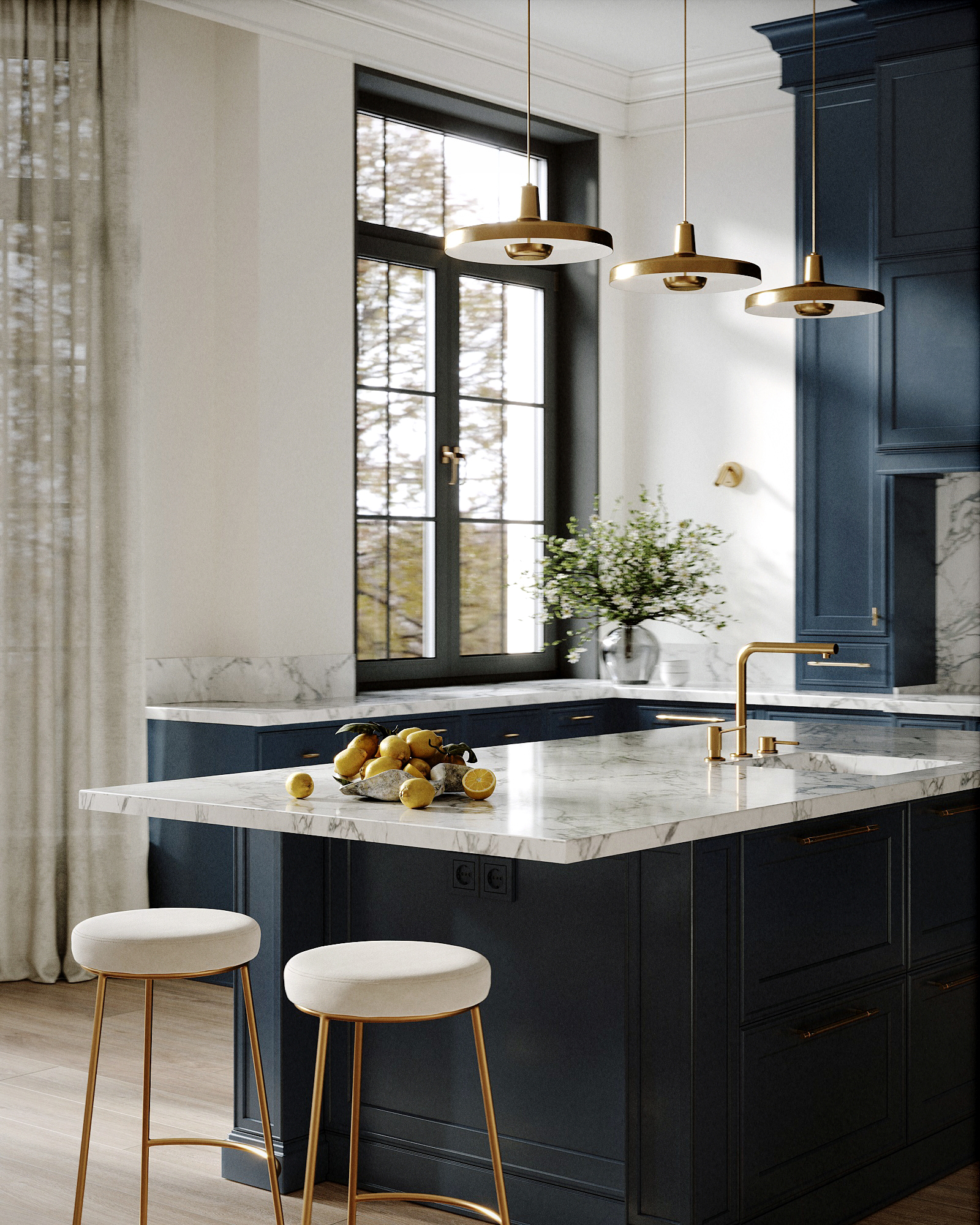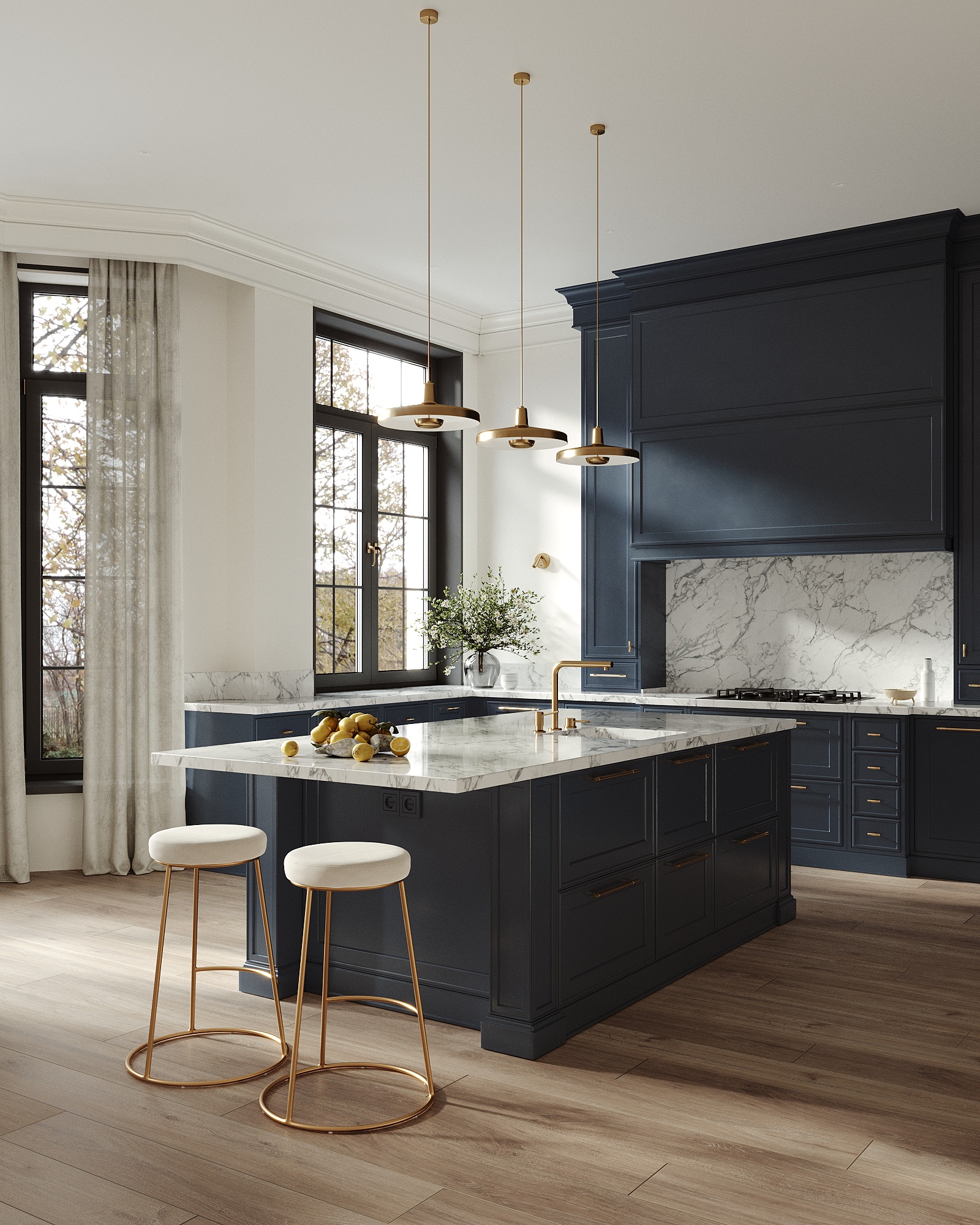 Я лично не понимаю зачем вы развернули остров. Он намного лучше станет вдоль кухни, и можно будет с внешней стороны поставить больше барных стульев. А то 2 штуки это совсем бюджетно. Почему то нет духовки, а только варочная панель. Тоже бюджетно выглядит. И стол с 4мя стульями как не из этой оперы. И 3 лампы тут не нужны, они слишком плотно висят.