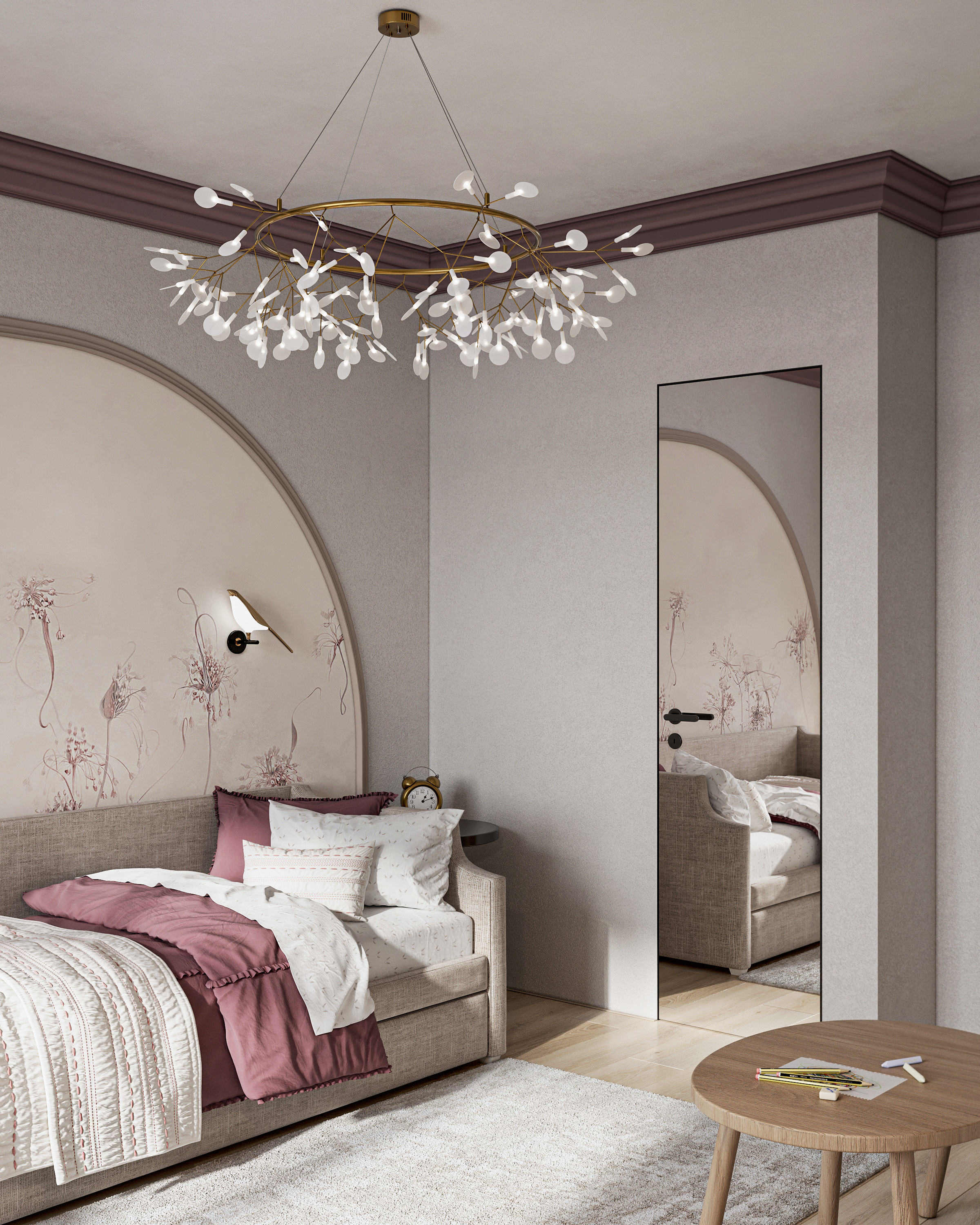 Уютная детская комната. Шторы создают визуальное разделение между игровой и учебной зонами, что помогает ребенку сосредоточиться на учебе, когда это необходимо. Предусмотрена зона для творчества. Таким образом, такая комната не только функциональна, но и способствует развитию ребенка, создавая подходящие условия для игр, учебы и отдыха.