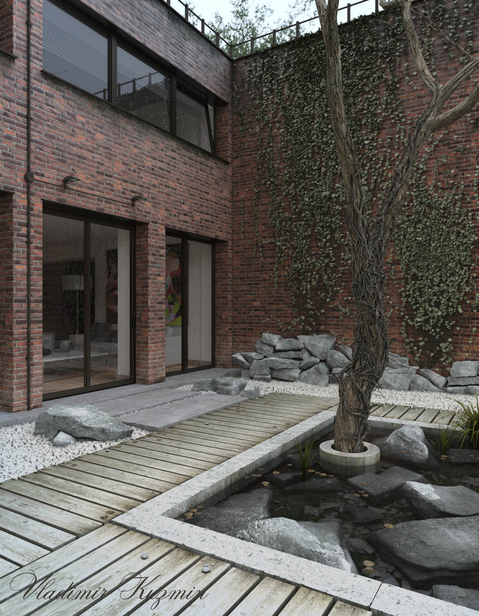 Дворик. Первый мой экстерьер сделанный в Максвелле,пока малые объемы, так как не знаю как поведет себя Максвелл ,по времени, с большими объемами, но предполагаю ему это не понравится!))) 19SL,7 часов с копейками.