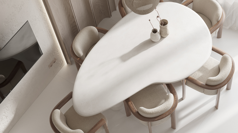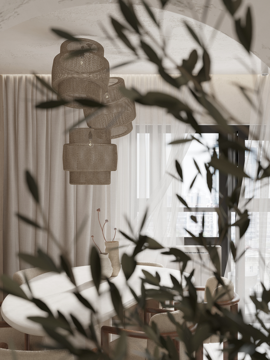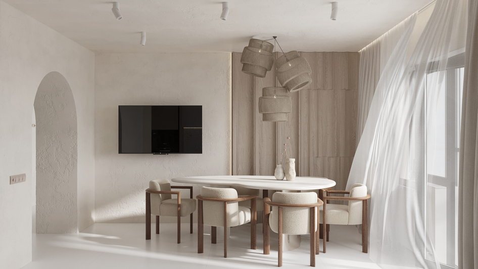 Теперь непосредственно про дизайн. Согласно ТЗ и логики стиля Эко, хотелось подобрать именно такие тёплые, природные, естественные оттенки, чтобы они как бы обволакивали хозяев и максимально расслабляли хозяев квартиры. Поэтому штукатурка стен выполнена в такой грубой, невыверенной форме и идёт от стен на потолок. Так же было решено как можно больше отказаться от общей симметрии, т.к. в природе её нет, так и сделать все линии максимально плавные, в связи с чем и появились: арка, стильные точечные светильники, деревянные панели, и место силы этого помещения – дизайнерский стол. Глядя на него, представляешь как хозяева собираются за ним сначала вдвоём, потом с друзьями, а далее, если семья разрастётся, то и всей уже большой семьёй. В этом месте происходит восполнение как физических сил за счёт трапезы, так и ментальных за счёт душевных разговоров. Была придумана концепция такого стола, за счёт каплевидной формы которого, она как бы притягивает мысленно, зрительно и физически человека в эту точку. Формы у стола максимально плавные, одна ножка, как и сам стол каменные, две других отлично сочетаются своей формой со стеновыми панелями, и выполнены из такой неоднородной, как бы состаренной латуни, из-за чего собственно и нельзя однозначно отнести этот стиль к эко стилю, так как там преобладать должны натуральные материалы: камень, дерево, керамика, а металл больше подходит под современный стиль. И венчает эту точку притяжения, такие плетённые большие люстры в стиле оверсайз, который на данный момент, как и неоднородный металл, является трендом в интерьере. В добавок про материалы, хочется отметить, что уют и мягкость здесь добавляют натуральные материалы из хлопка или льна. Использованы несколько сценариев освещения: подсветка кухни, закарнизная подсветка, подсветка от панелей, точечное освещение и люстра. В качестве разнообразия и акцентов здесь использованы как было сказано металлические ножки у стола и черные вставки у мебели, которым вторит черная техника, смеситель с раковиной и балконные рамы.