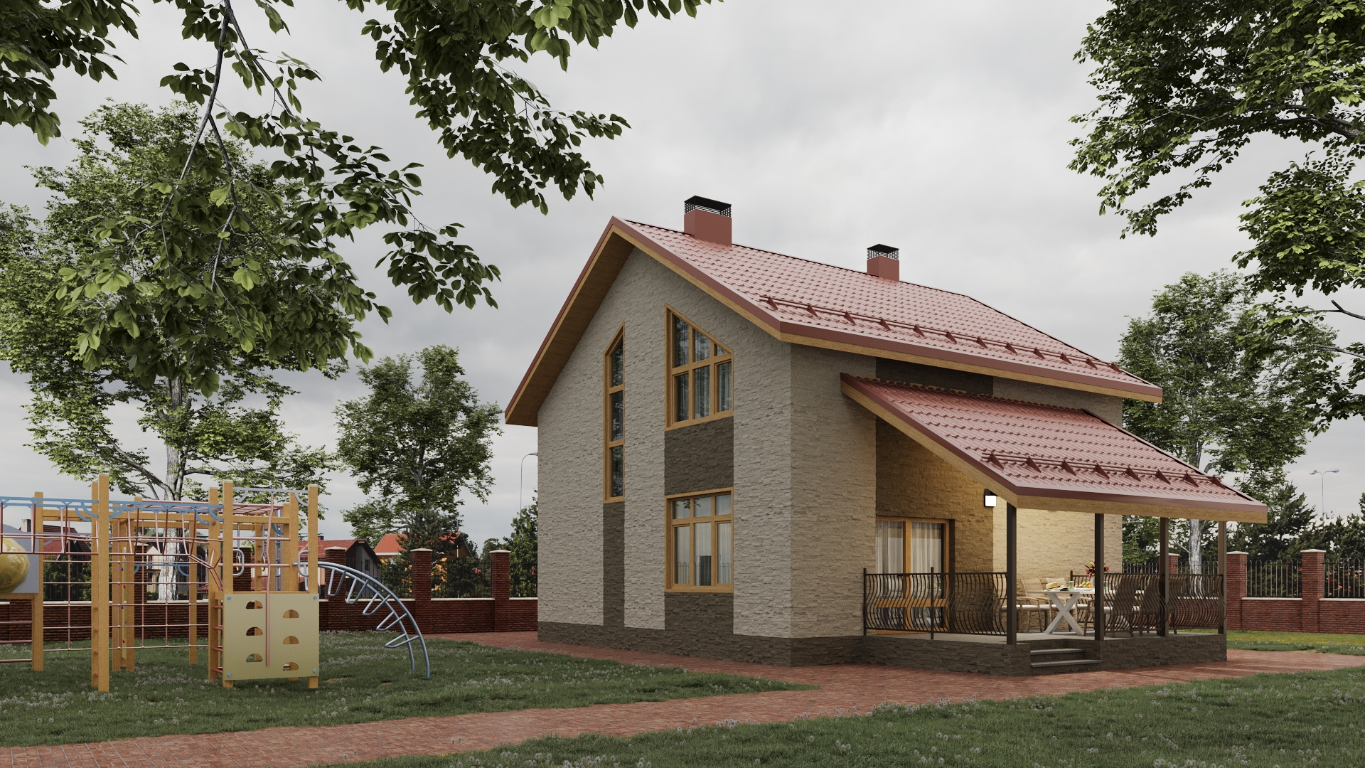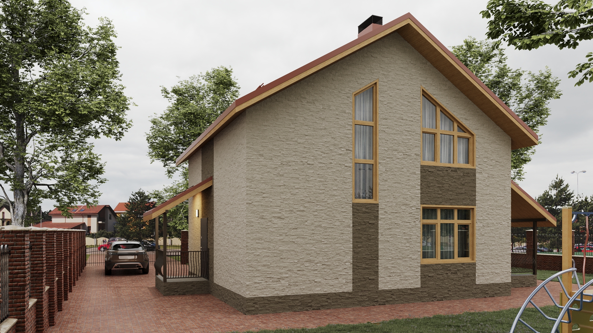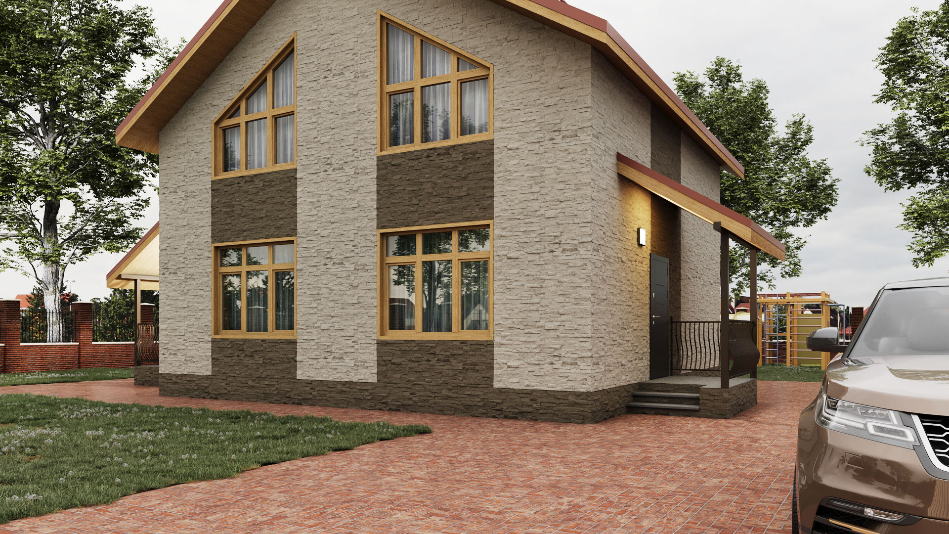 ракурсы конеша страшненькие. Как и домик. Все-таки цвет рам я бы взял другой, темнее. Вырвиглазную плитку убрал. Цоколь обычно выделяют, хотя бы отбивкой или капельником. Ливневки не хватает