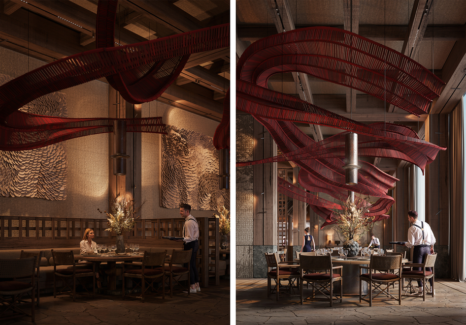 FENG YIN is a dining stage where wind becomes form. A sculptural crimson ribbon drifts across timber grids and stone, tracing a calligraphic line that binds reception, bar, main hall and the open kitchen. The palette is restrained—charred wood, dark stone, patinated metal—so that light and shadow write the atmosphere. Full project