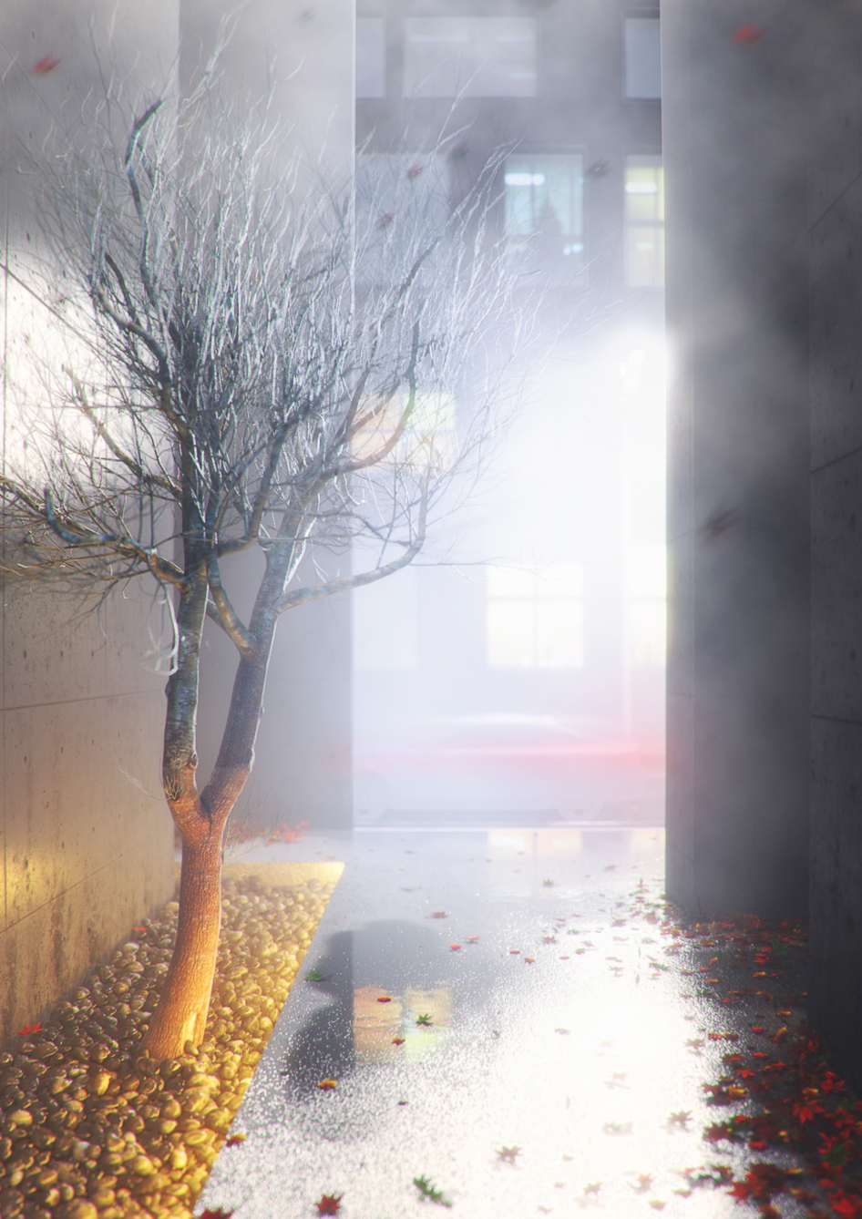 Интересно смотрится, но тротуар (материал и лужа) и эти ядреные листья портят всю картину.