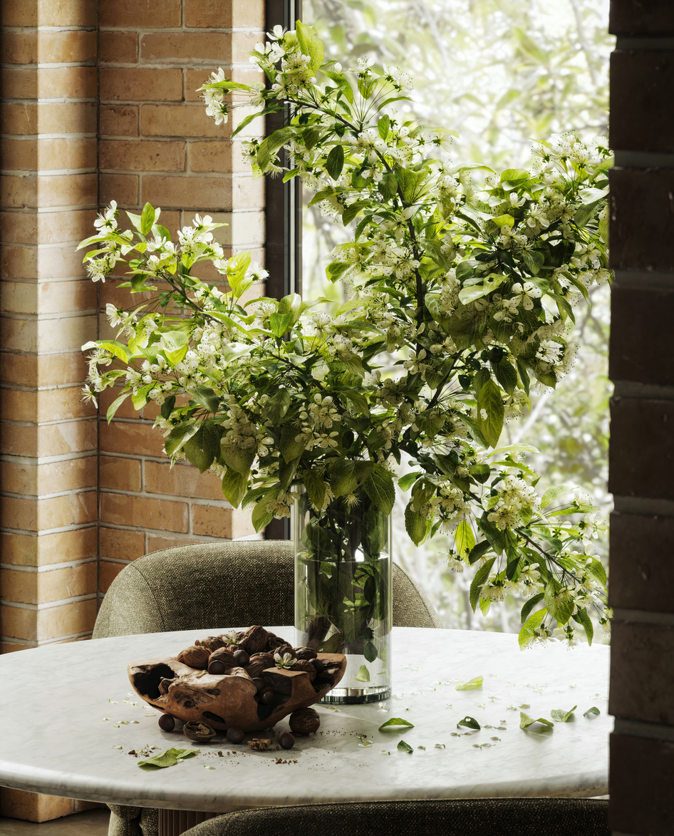 Букет цветущая ветка, весенние цветы в стеклянной вазе