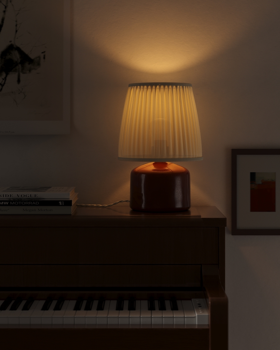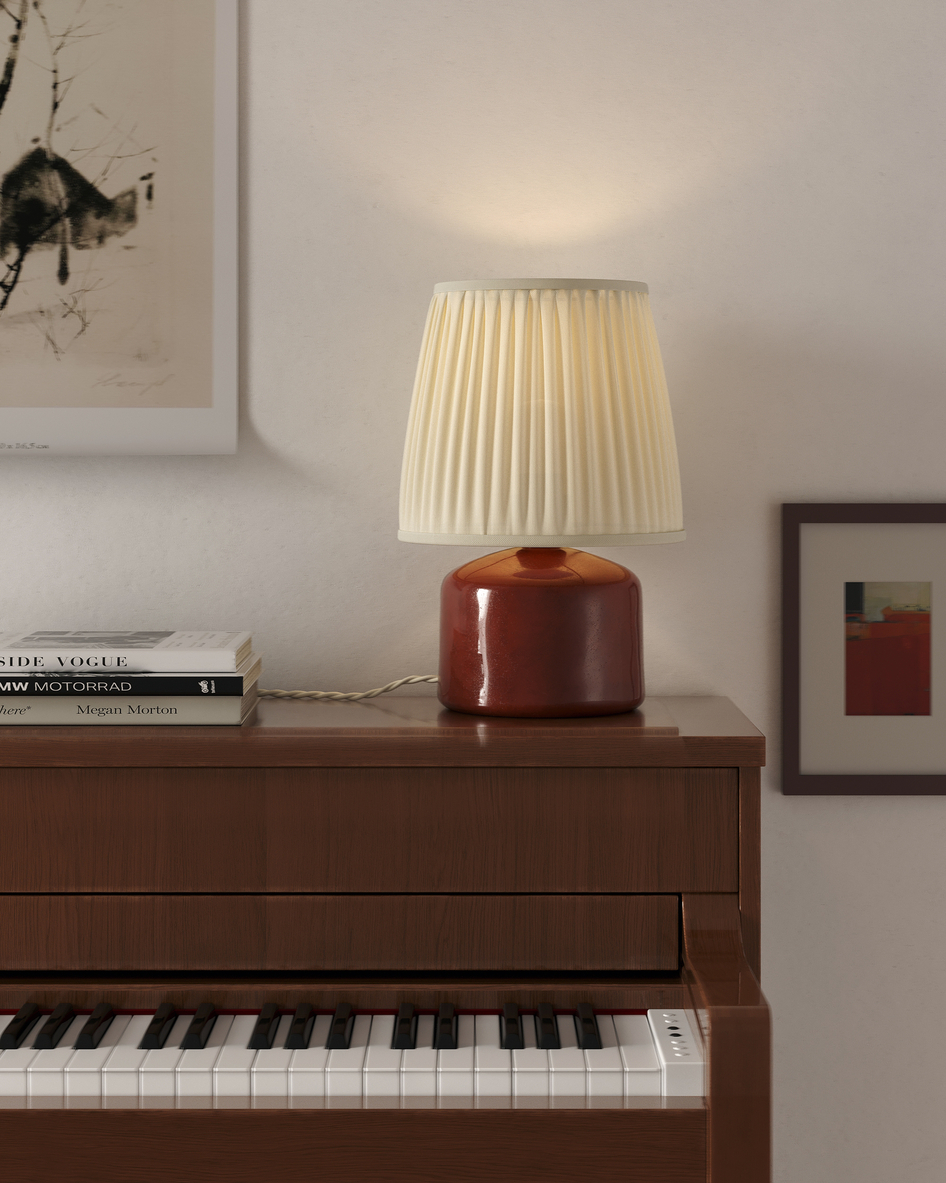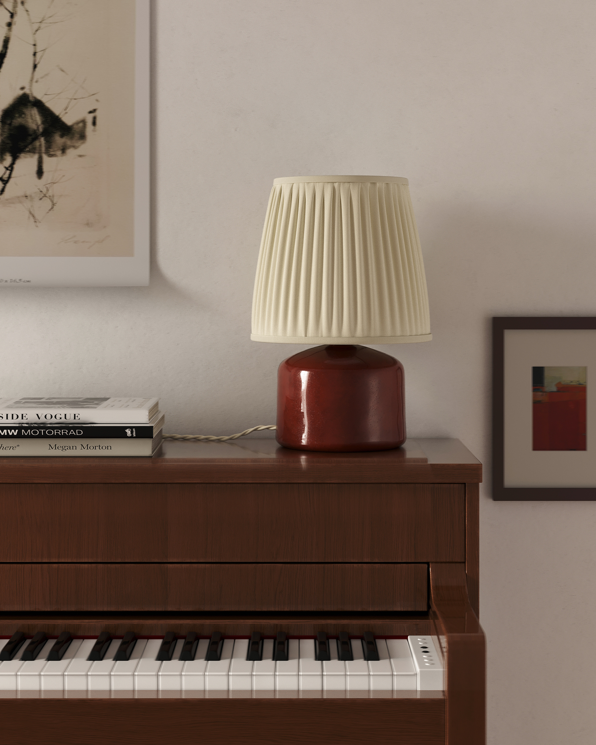Фрагмент интерьера с небольшой лампой из керамического основания и складчатого хлопкового абажура 3ds Max 2025, Corona Renderer 11