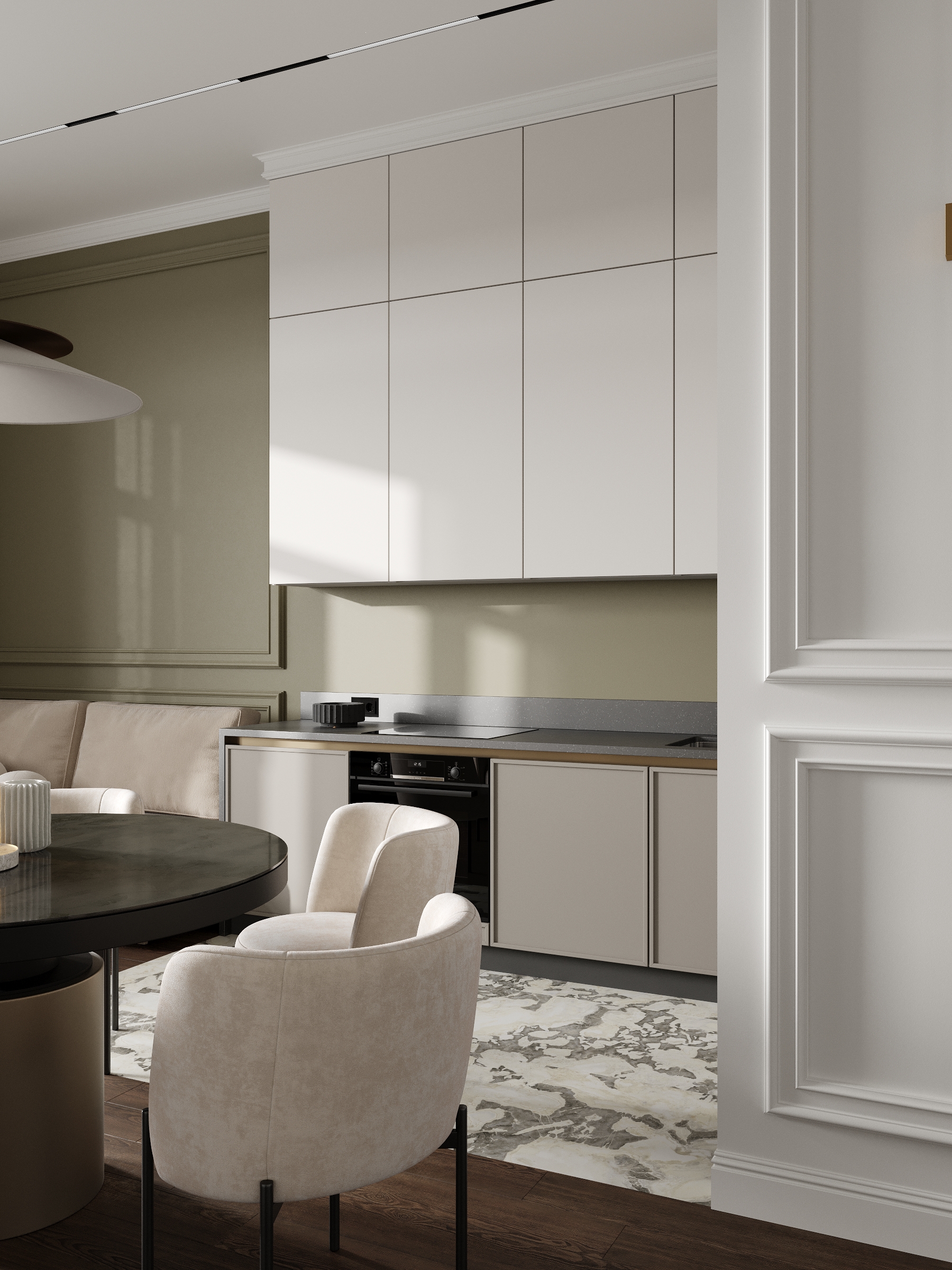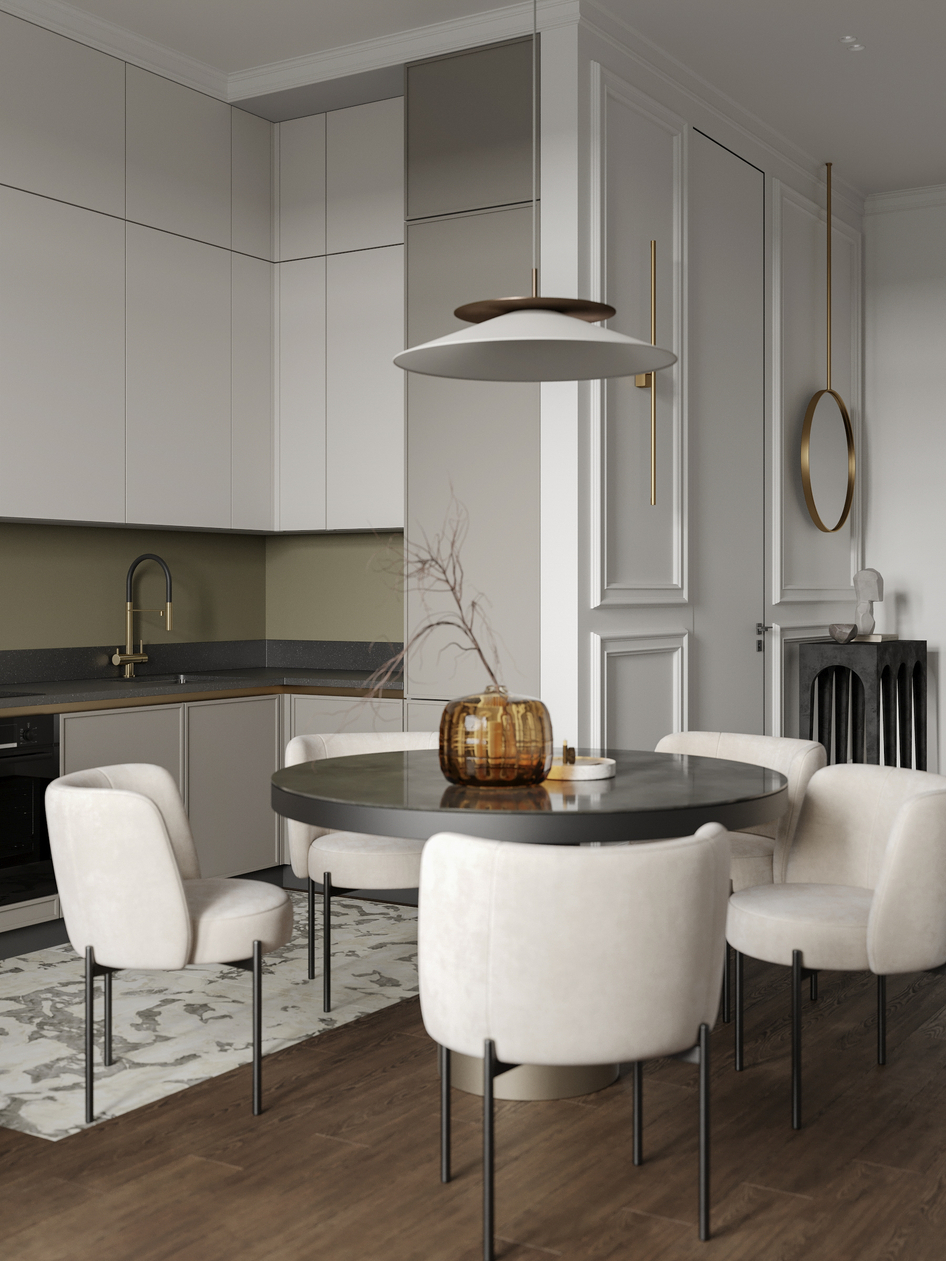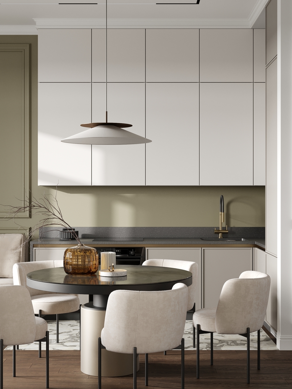 Современная кухня-столовая в нейтральных тонах с элементами минимализма и изысканным декором. Элегантная мебель, мягкое освещение и тёплые акценты создают уютную атмосферу для приёма пищи и общения.