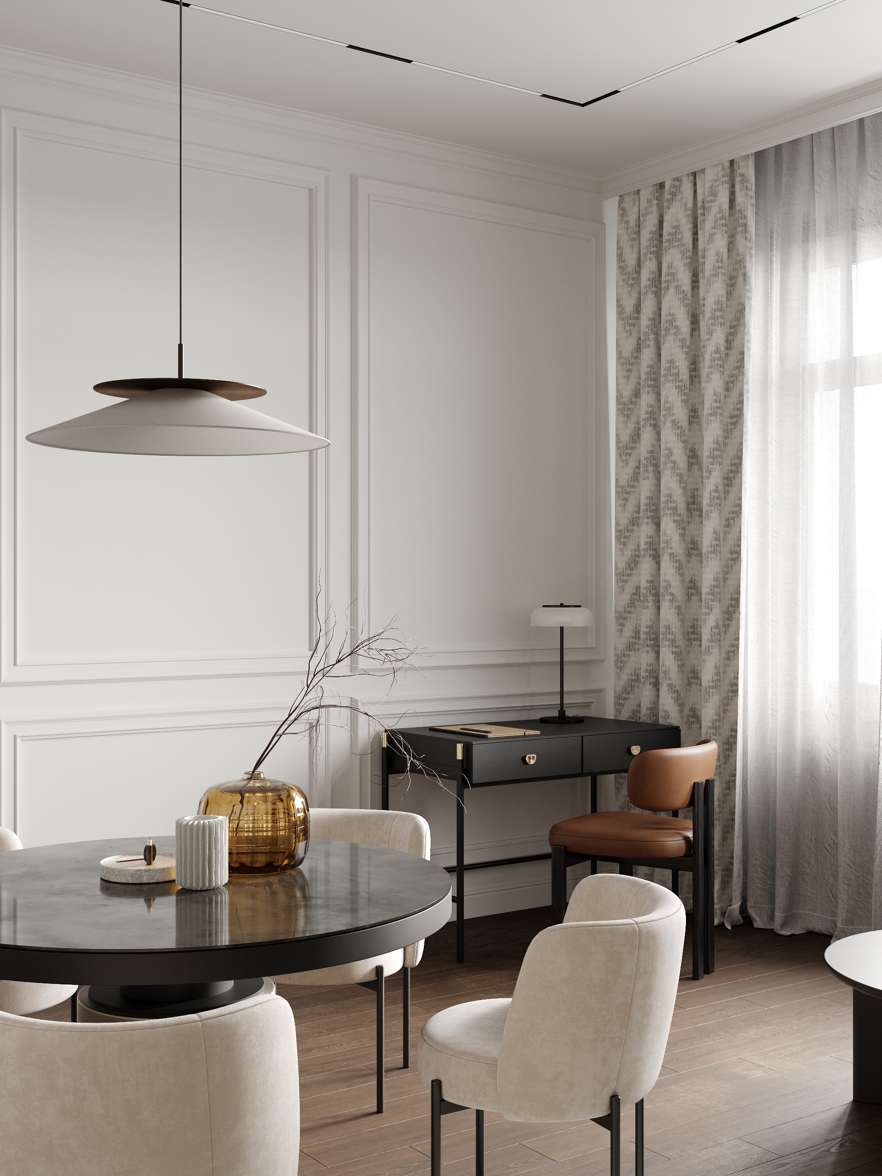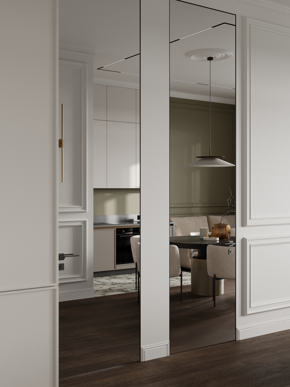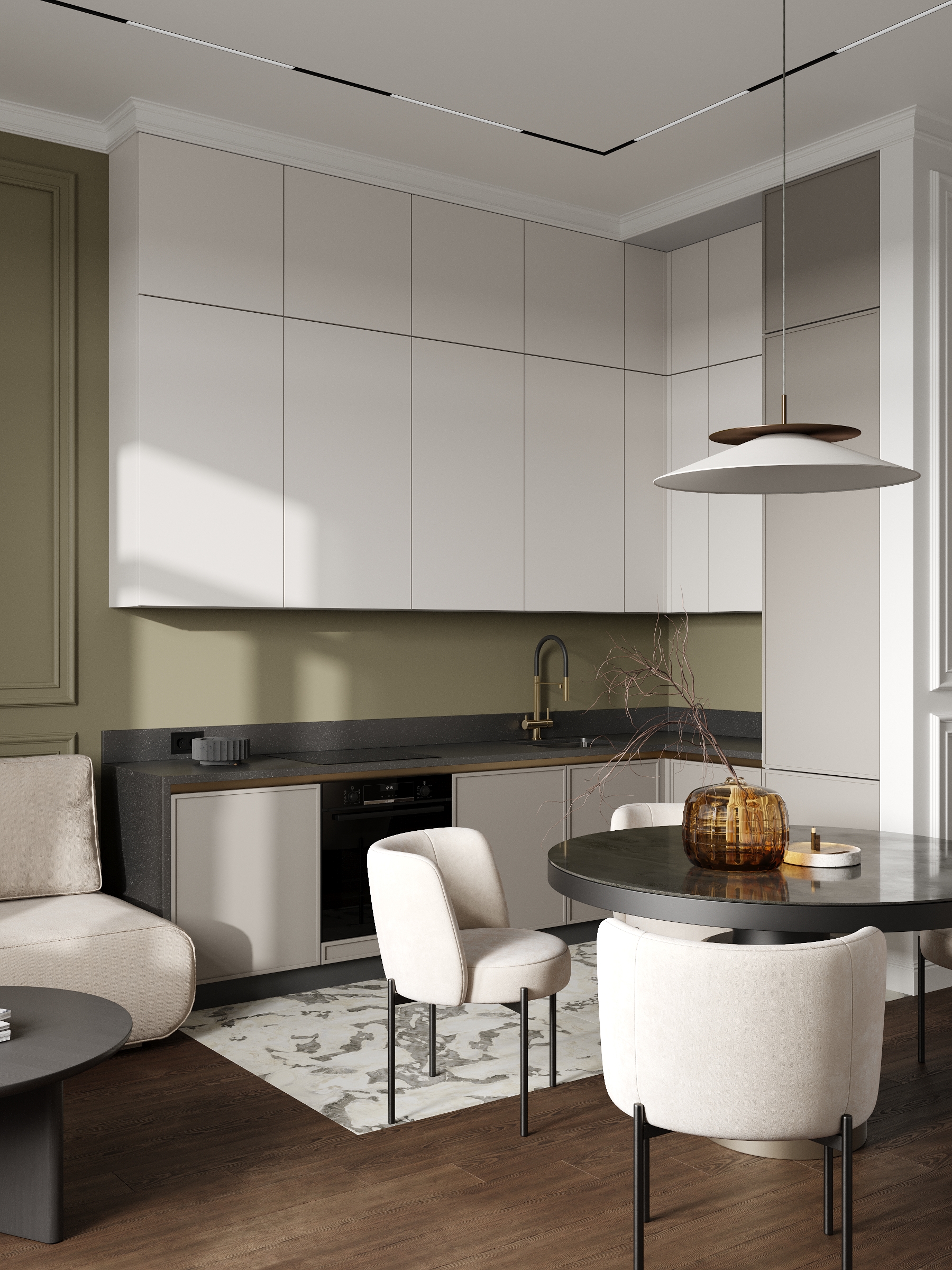 Современная кухня-столовая в нейтральных тонах с элементами минимализма и изысканным декором. Элегантная мебель, мягкое освещение и тёплые акценты создают уютную атмосферу для приёма пищи и общения.