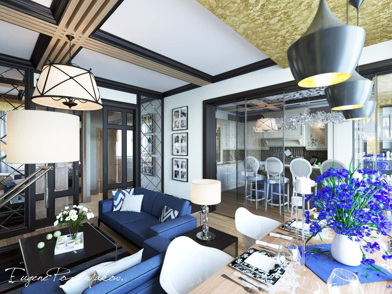 На первый взгляд картинка производит приятное впечатление, но только на первый. Полнейшая каша со стилистикой. Даже если это эклектичный интерьер, то мягко говоря безвкусный. Ничего личного к автору проекта. Помпезная арка и рельеф потолка в стиле арт деко смешан с хайтечной консолью под тв, здорово. Смотрится богато и солидно. Но люстра в стиле прованс, сюда явно ни к месту. Стулья в столовой зоне , не относятся ни к одному из перечисленных трех стилей, что еще больше усиливает неразбериху в стилевой концепции данной работы.
