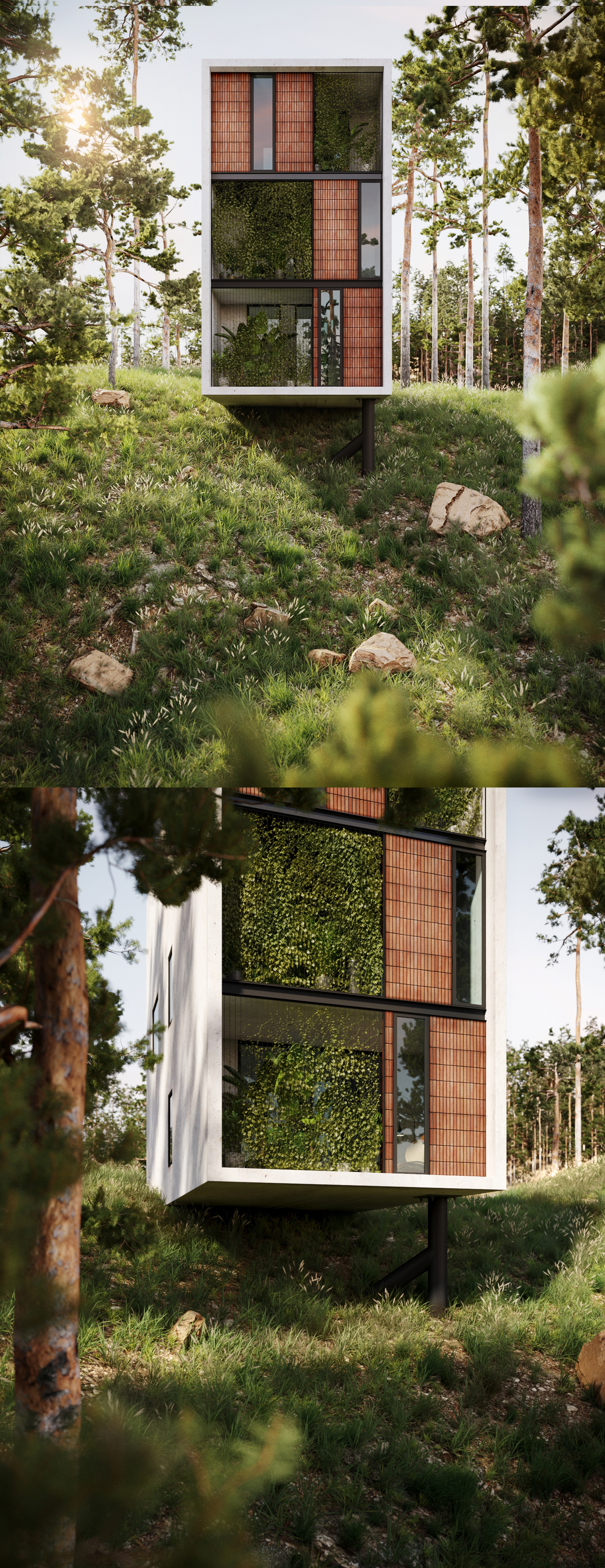прикольно, как идея. Но хотелось бы увидеть планировку. потому-что судя по картинке половину этажа занимает помещение с панорамным окном, а вторую часть этажа должна занять лестница со всеми своими площадками... и тогда возникает вопрос: "а что это?"