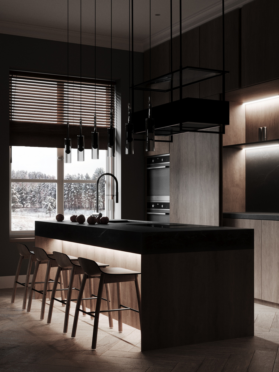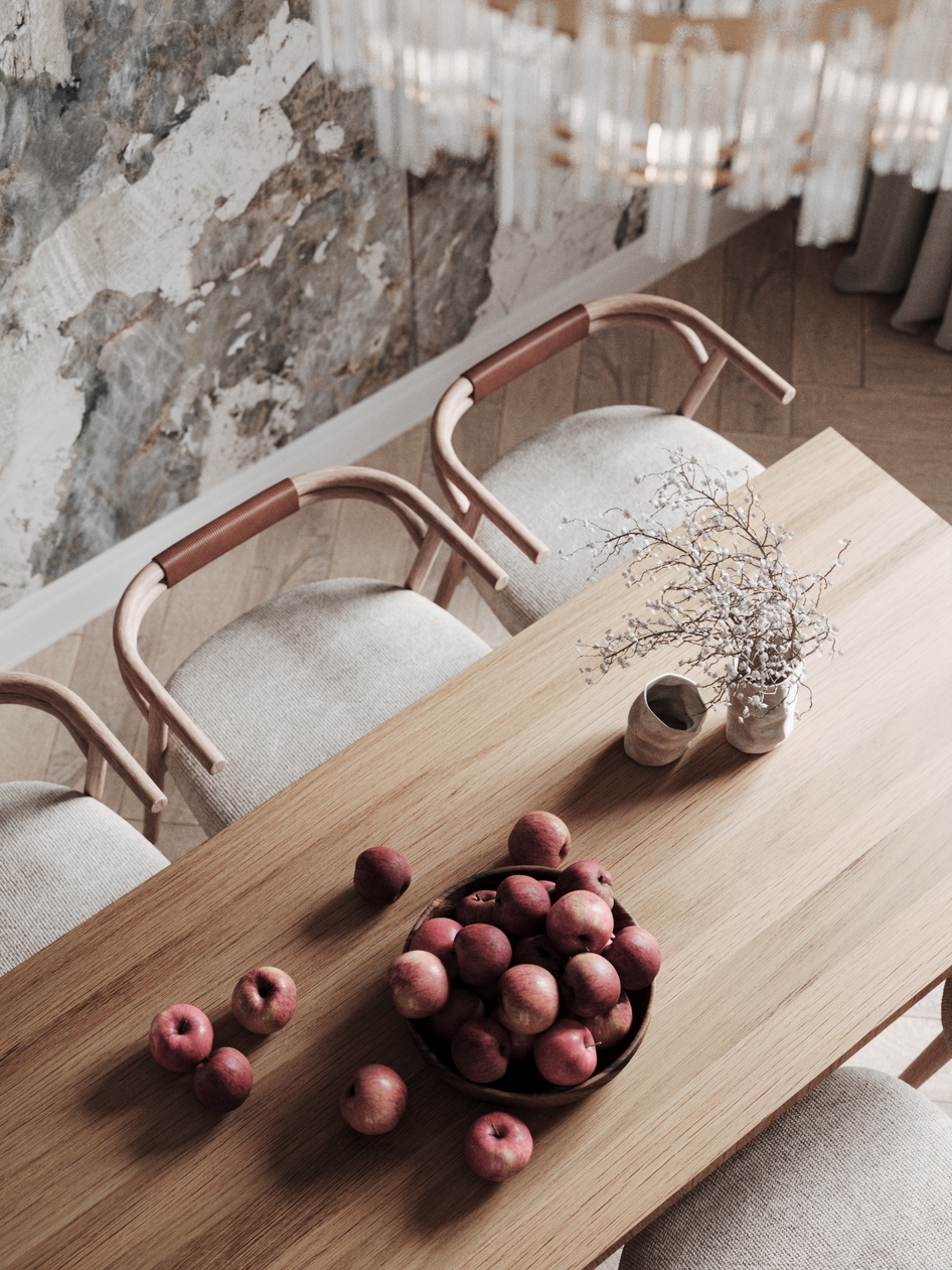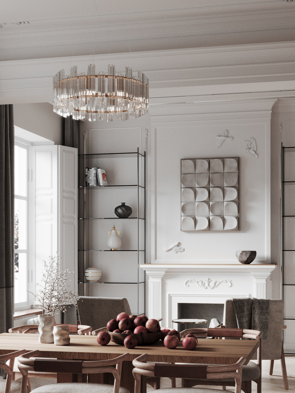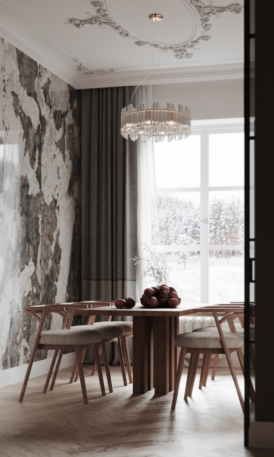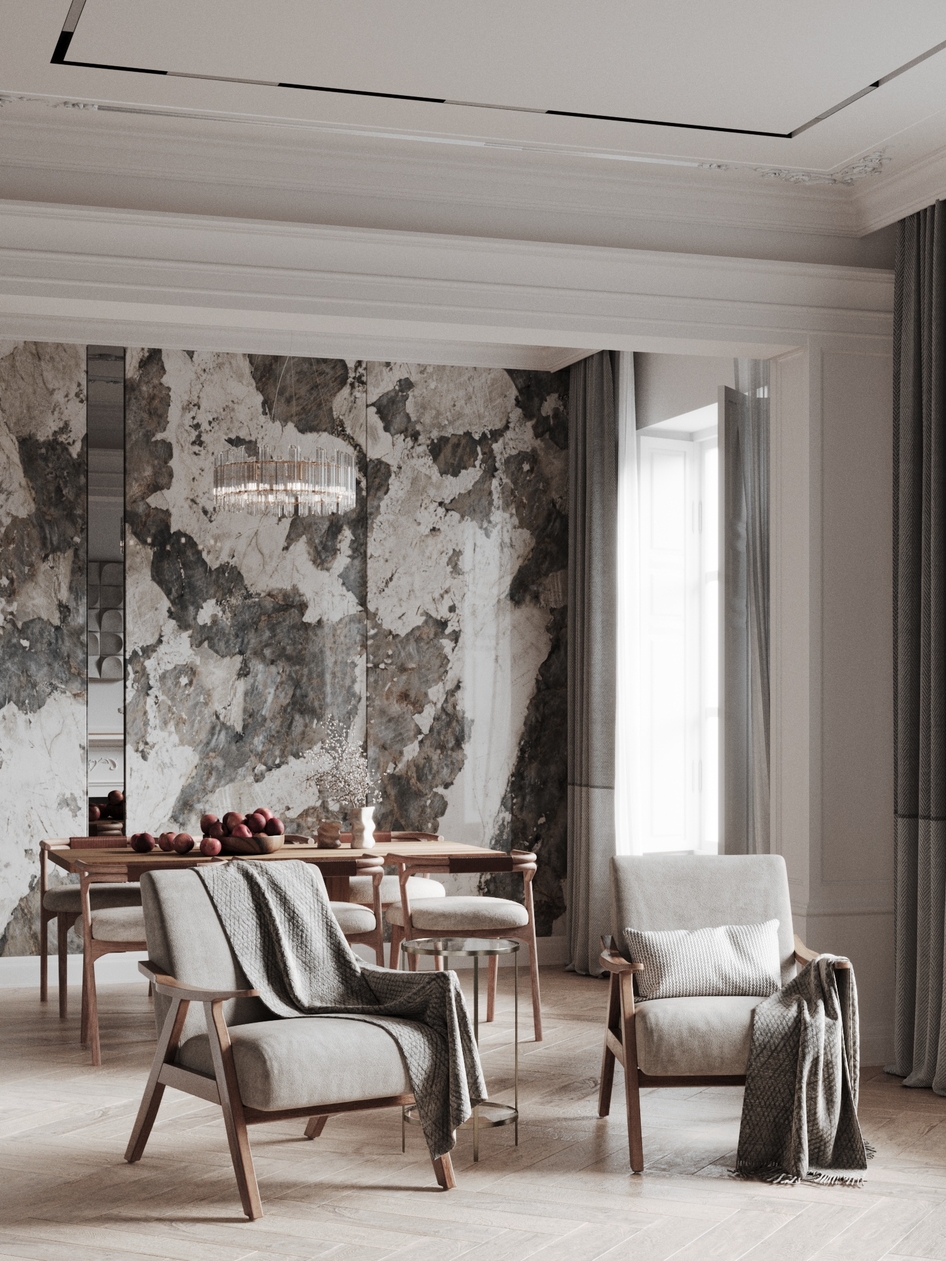 решение - природные материалы (дерево, камень, похожий на березу), активные элементы классики, уютные обволакивающие пространства, в которых как раз можно укрыться и визуально тяжелые ткани.