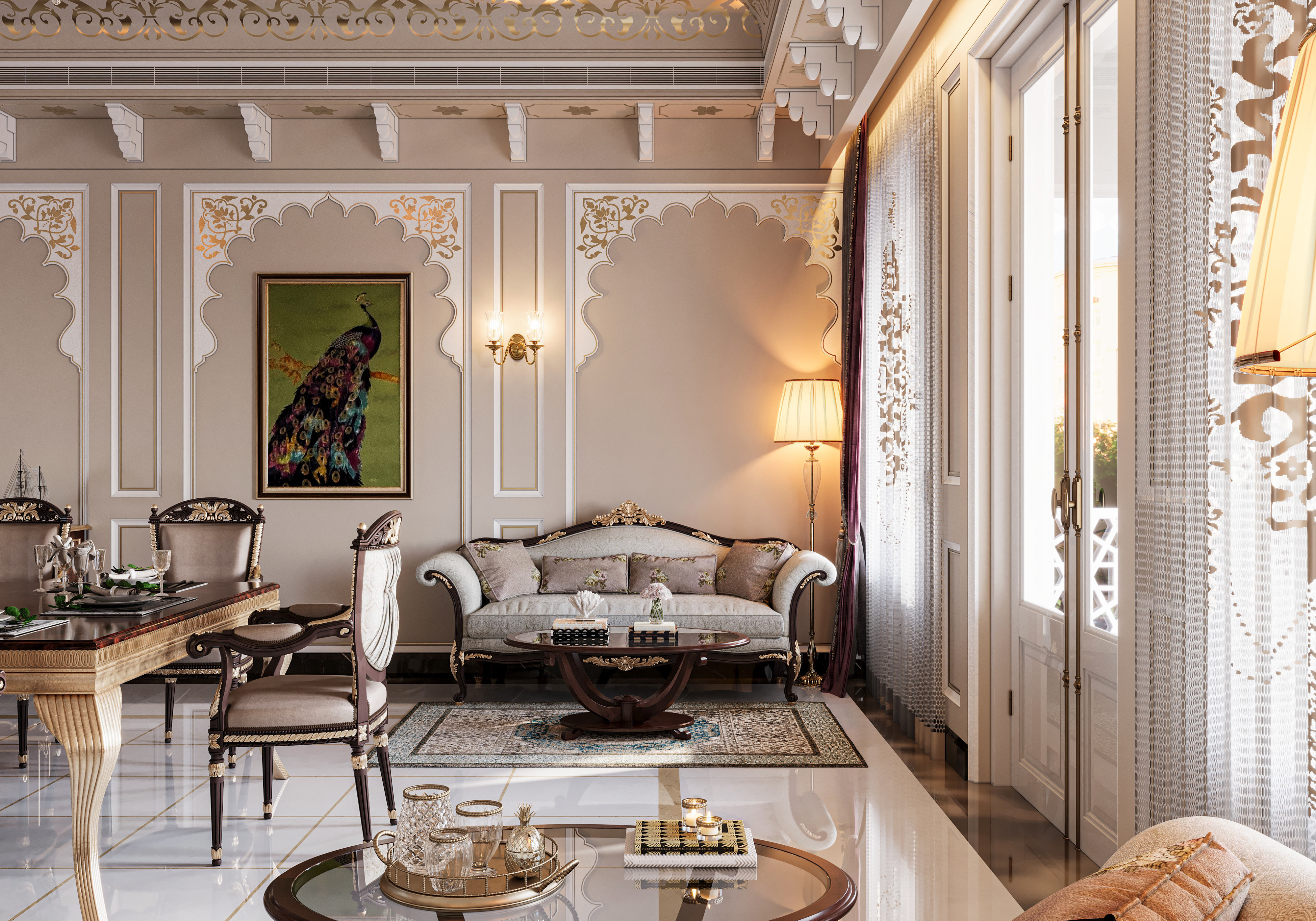 A traditional Indian classical dining area exudes timeless elegance and cultural richness, blending heritage design with functional comfort. The space is adorned with intricately carved wooden furniture, typically in dark teak or rosewood, featuring ornate motifs inspired by Mughal or Rajasthani craftsmanship. The dining table is often large and majestic, surrounded by high-back chairs upholstered in rich fabrics like silk or brocade.