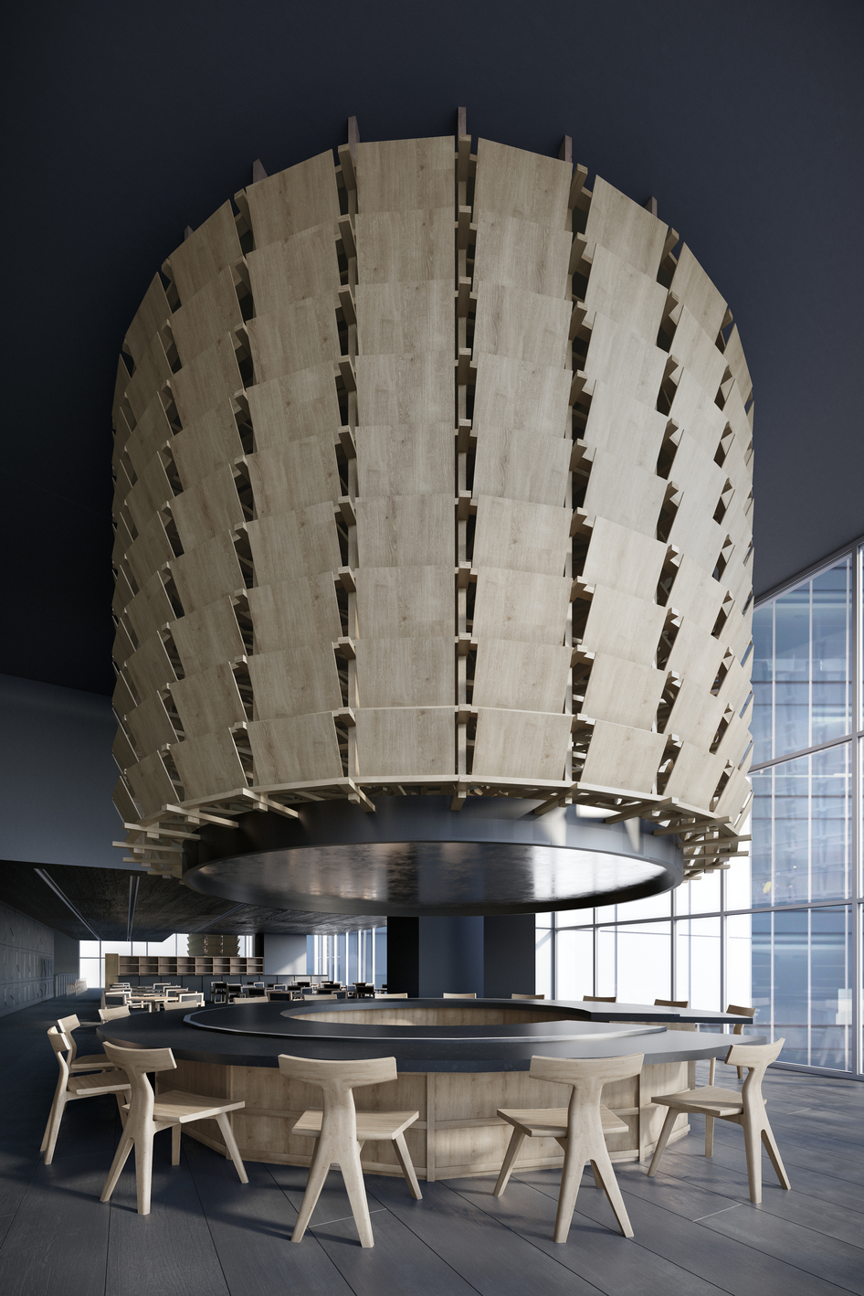 В теории, выдержит с запасом. При условии, что основной материал конструкции это дерево (куб весит меньше тонны), а перекрытие попрочней хотя бы балконной плиты (800 кг/м2). В крайнем случае предположим, что в перекрытии спрятан двутавр, на который как люстра крепится данная конструкция)