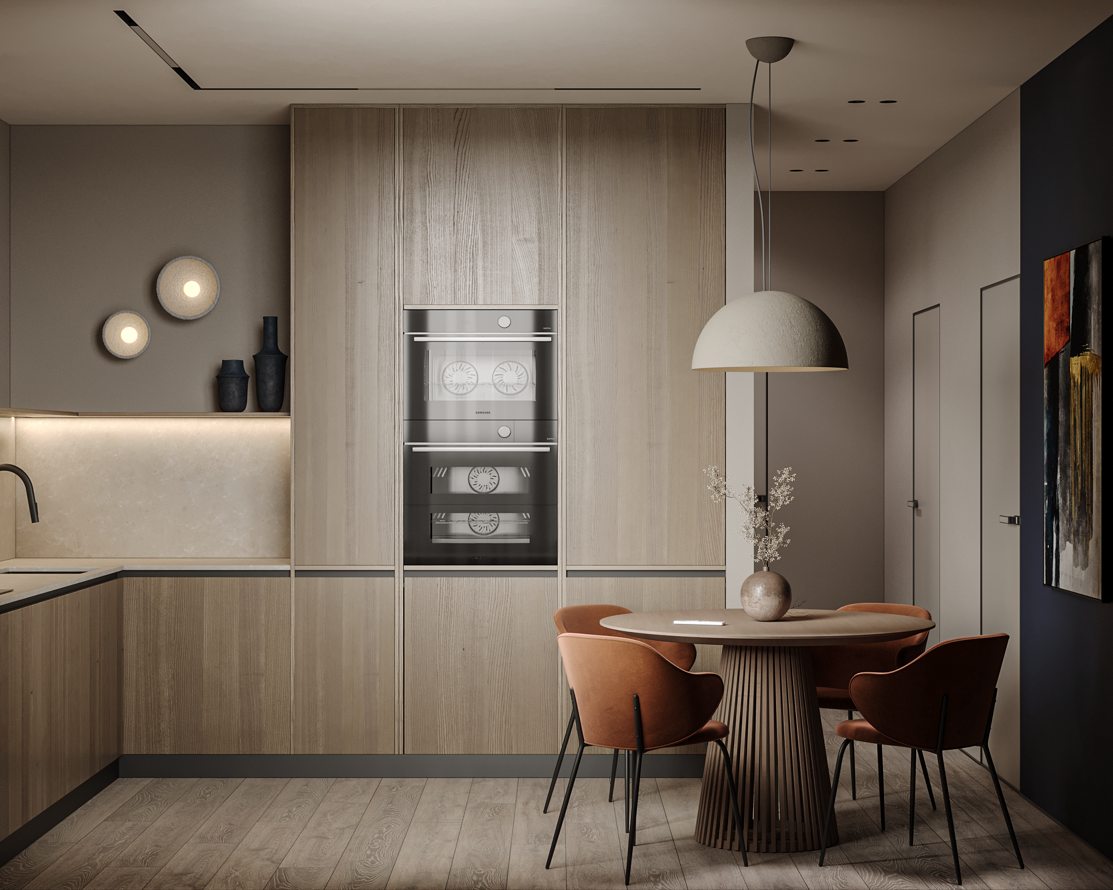 Warm wood tones, clean lines, and a bold accent wall breathe new life into the Japandi aesthetic.