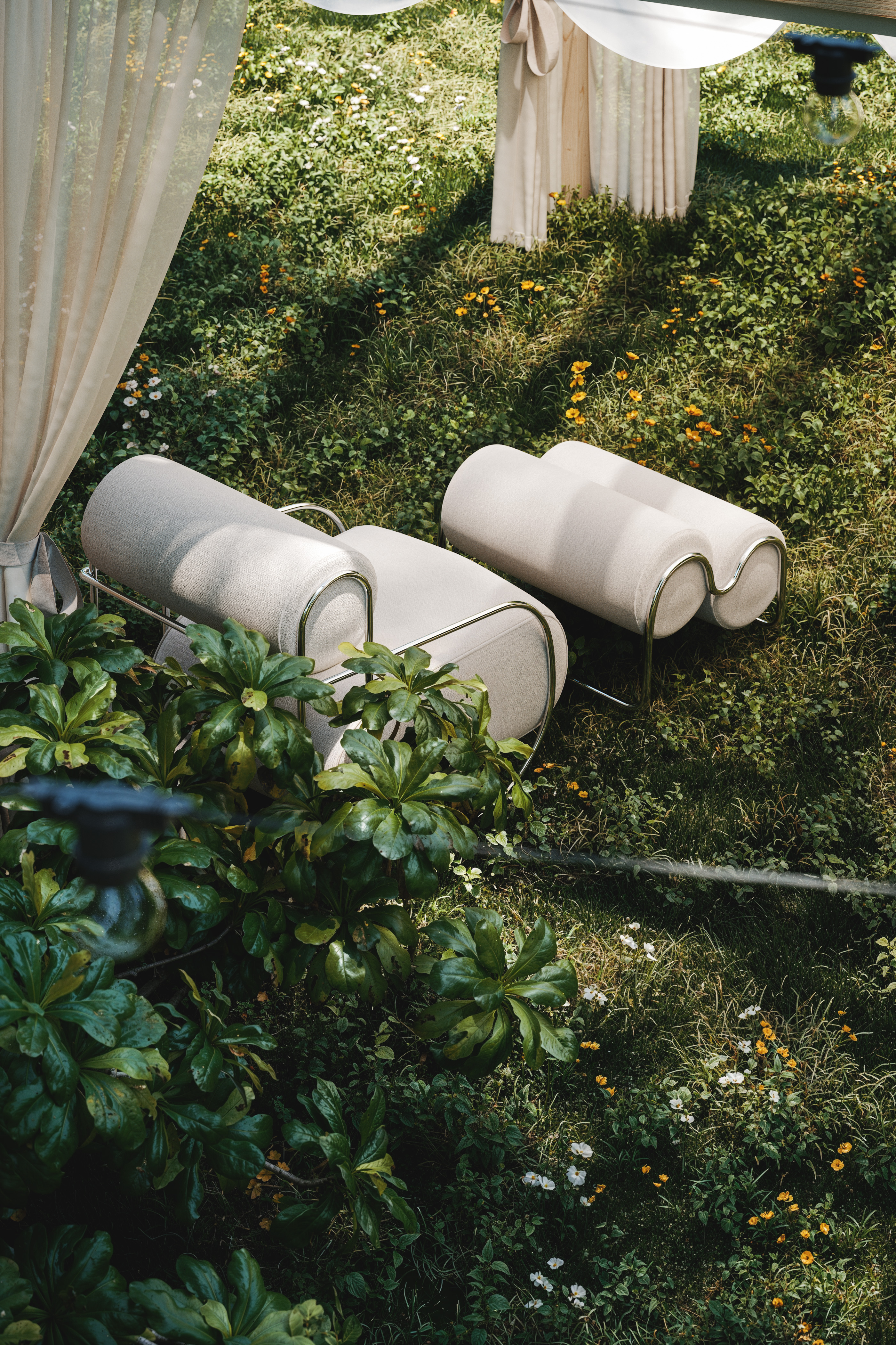 На этой чарующей фотографии изображена уютная беседка посреди сказочного леса, окутанная мягким солнечным светом, пронизывающим листву высоких деревьев. Легкие полупрозрачные занавеси нежно колышутся на ветру, создавая атмосферу уединения и покоя. Внутри беседки — изысканные светлые кресла округлой формы, словно приглашение к отдыху и созерцанию. Вокруг буйствует живая природа: зелень, дикие цветы, пруд и спокойствие леса, которое словно замедляет время. Это место кажется идеальным для медитации, тихого разговора или вдохновения — уголок гармонии, спрятанный в самом сердце природы.