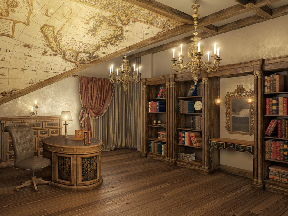 Виз -хороший. Диз - не очень. Ощущение что мебель стоит не на своих местах, + как сказали выше, пустовато. И явно не пропорциональные размеры книг-стола-люстр-кабинета, что-то где-то перепутанно.