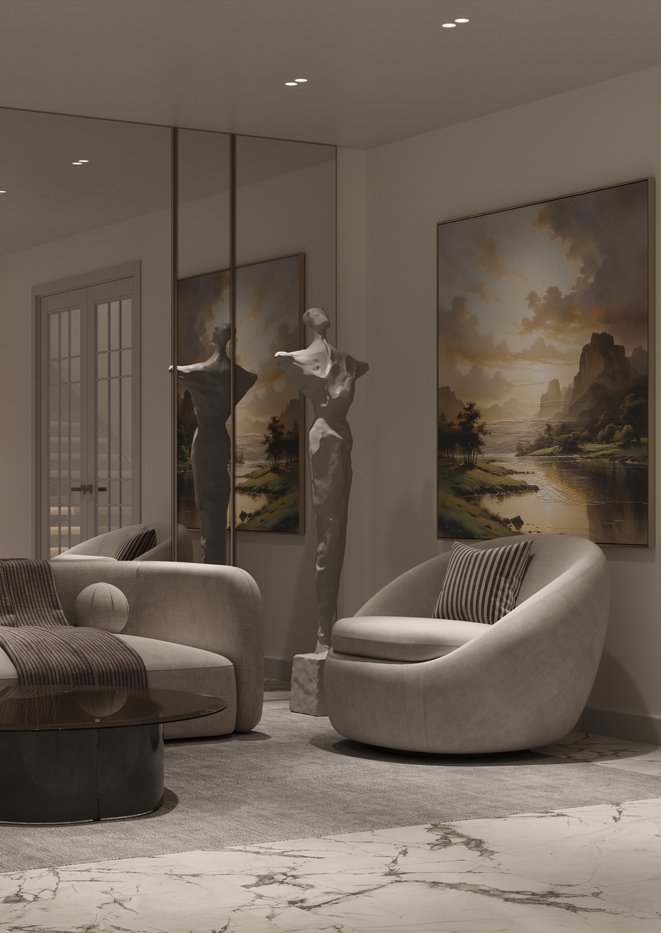 Цель — показать гармонию минимализма и уюта в подземном холле, который стал полноценной частью дома, а не просто техническим помещением.