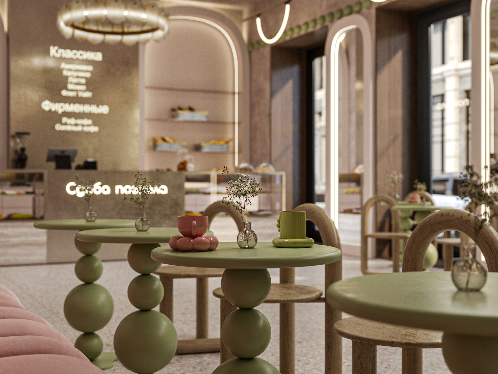 Пошуршав в желтом поисковике материалы, я влюбилась вот в эти, на последнем рендере. Сердце стало биться чаще, а нейронные связи уже рисовали образ заведения. Ну, а дальше дело техники: чих пых, расстановка, моделирование, настройка материалов, пререндеры и, наконец, финалочки. Ну и самая финалочка, прогнать пару рендеров в ИИ для атмосфэры. Не зря же с меня ежемесячно списываются мои честно заработанные на удивительный и одновременно пугающий в своей реалистичности искусственный интеллект.