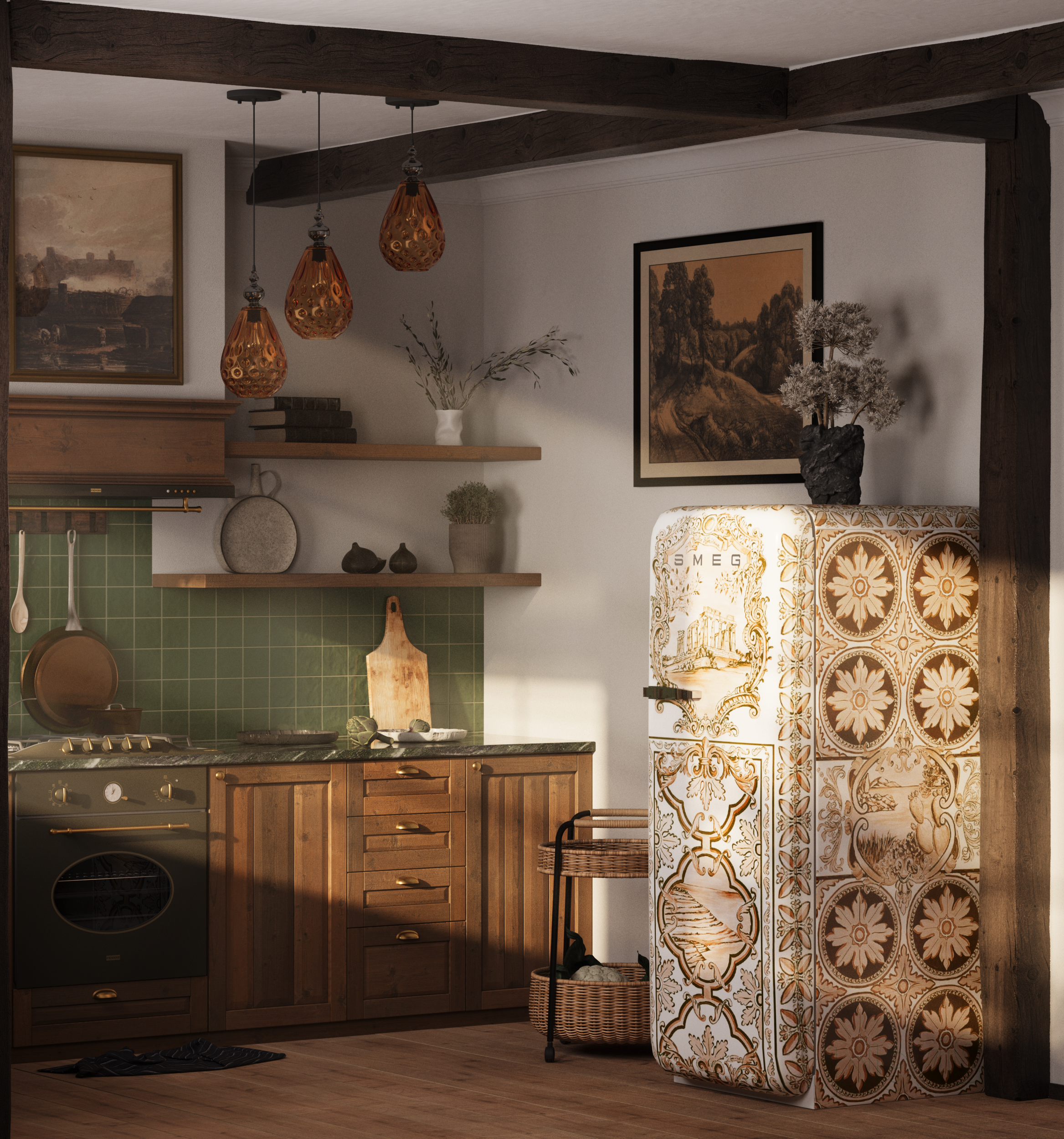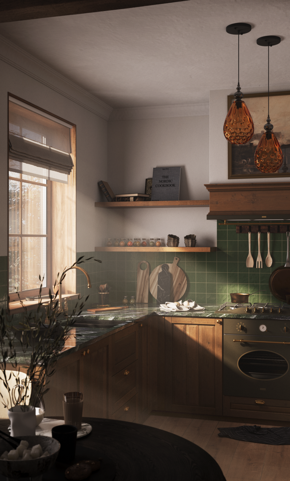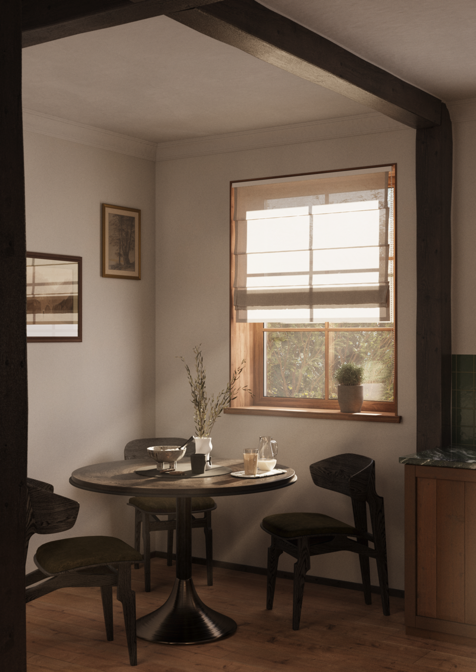 свет и правда не плох в целом. По техническим моментам, совсем нет переотражений от пола на объекты, как будто пол у вас совсем ничего не отражает. В реале , даже матовый пол , всегда дает вторичный отскок. Оконные проемы обналичены деревом, которое тоже по ходу без отражений или без бампа , смотрится просто, по техническому моменту, эта обналичка слегка торчит от стены, т.е. не за подлицо, что смотрится тоже не очень, может стоило какой то узкий наличник туда прицепить. По столешке видно, что просто накинули увм мэп, текстура на торце столешки прерывает рисунок, который идет по верху. Видно, что заморочились с переходом от балок на потолок, смотрится прикольно. Ну и шумновато, много шума, возможно стоило побольше пассов поставить.