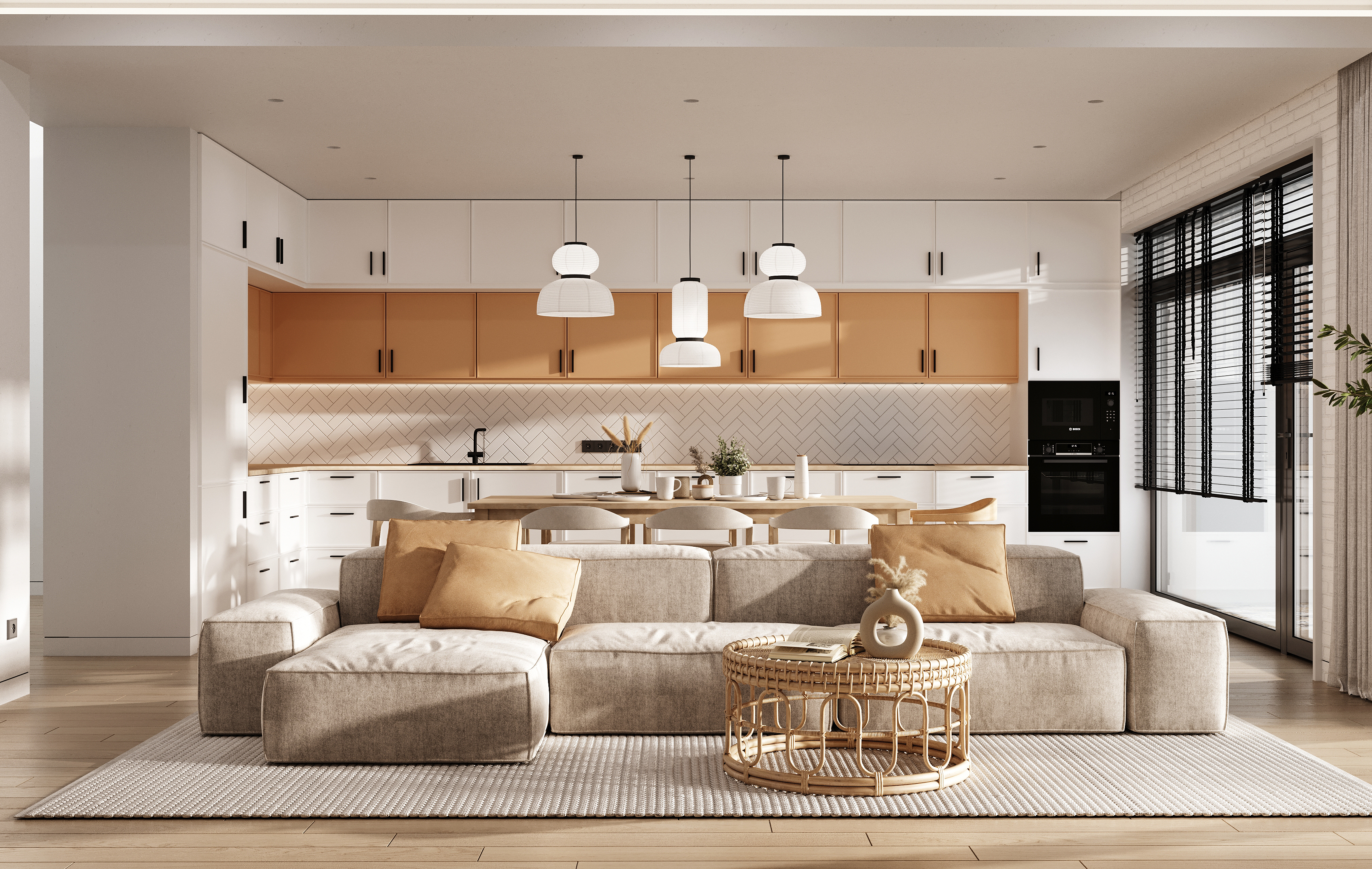 Комната выполнена в светлых тонах, акцентным элементом является кухонная мебель в оранжевом оттенке