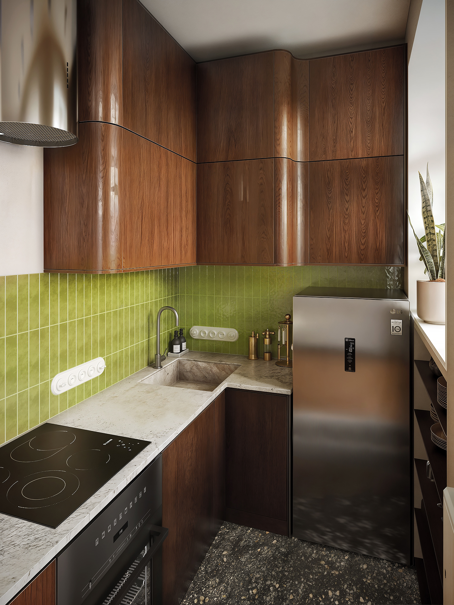 Открытые полки, ретро-бытовая техника, состаренные поверхности и приглушённый свет создают не просто интерьер, а живую сцену из европейского прошлого, адаптированную под современные задачи.
