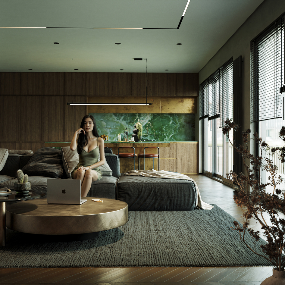Даже не подумал бы , что рендеры! Отличная работа. А в отношении девушки у меня нет вопросов, диван невысокий, даже заниженный, поэтому пропорции девушки хорошо показывают масштаб мебели и деталей. Странно читать комментарии людей, которые не чувствуют это! Возможно причина того, что не понимают размеры мебели, и на фоне мебельного наполнения девушка кажется большой, хотя видно, что все сомасштабно.)