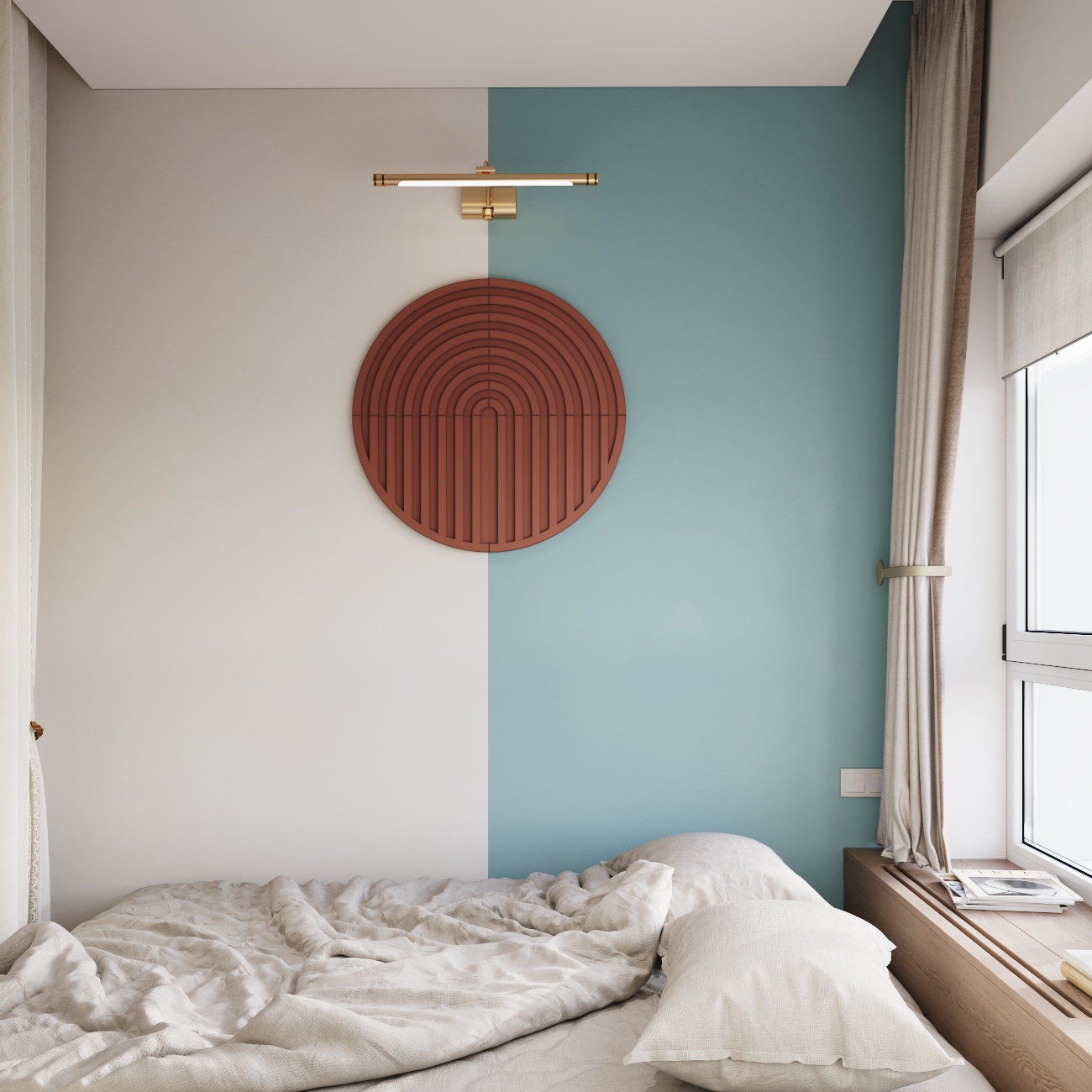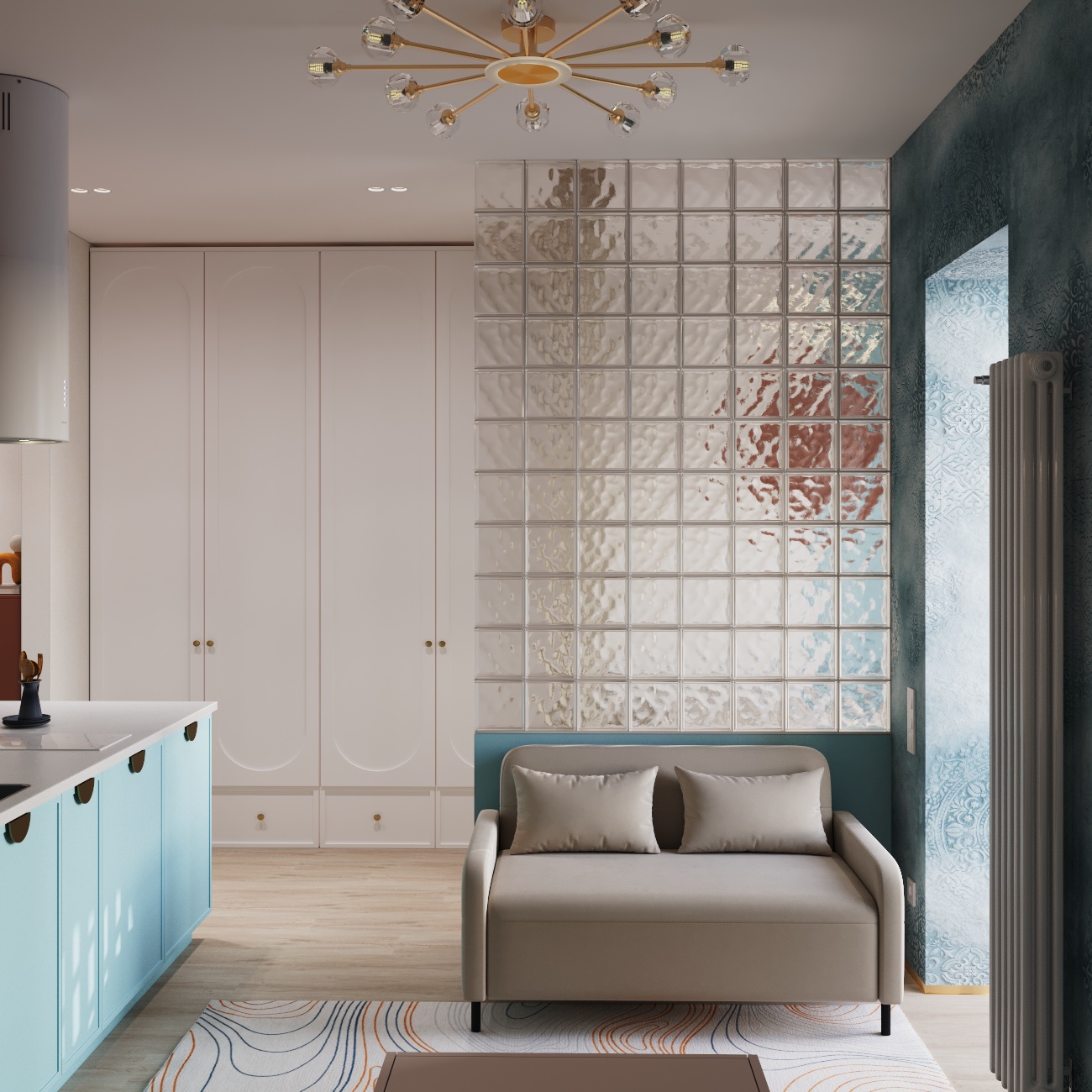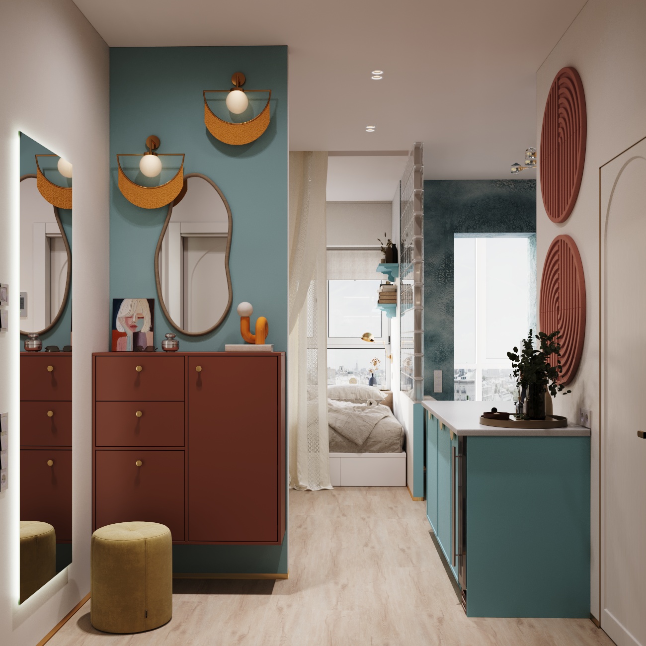 Эта компактная студия — пример того, как даже небольшое пространство может обрести выразительный характер. Здесь яркие оттенки не кричат, а мягко заявляют о себе, создавая уютную, но живую атмосферу.