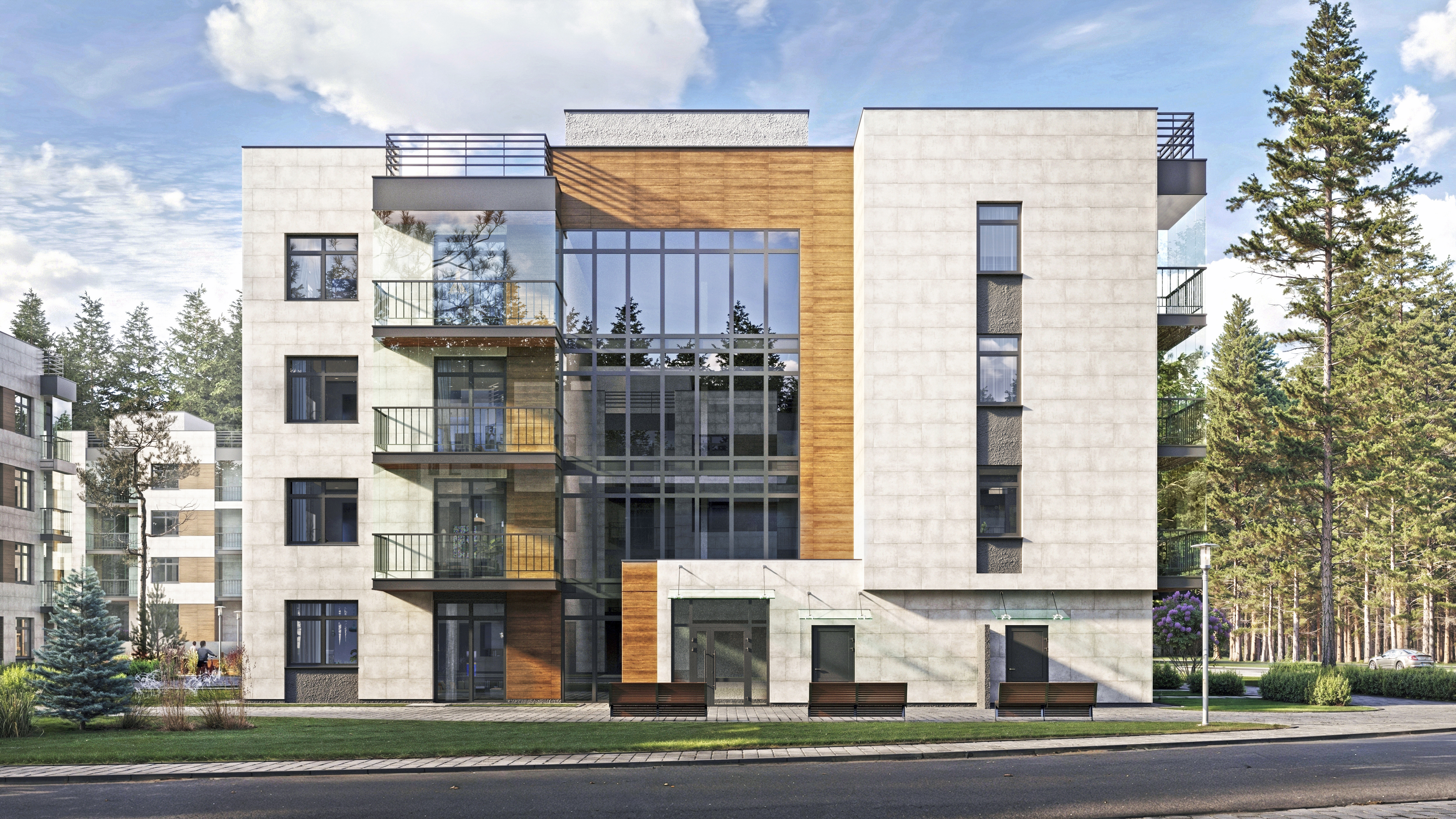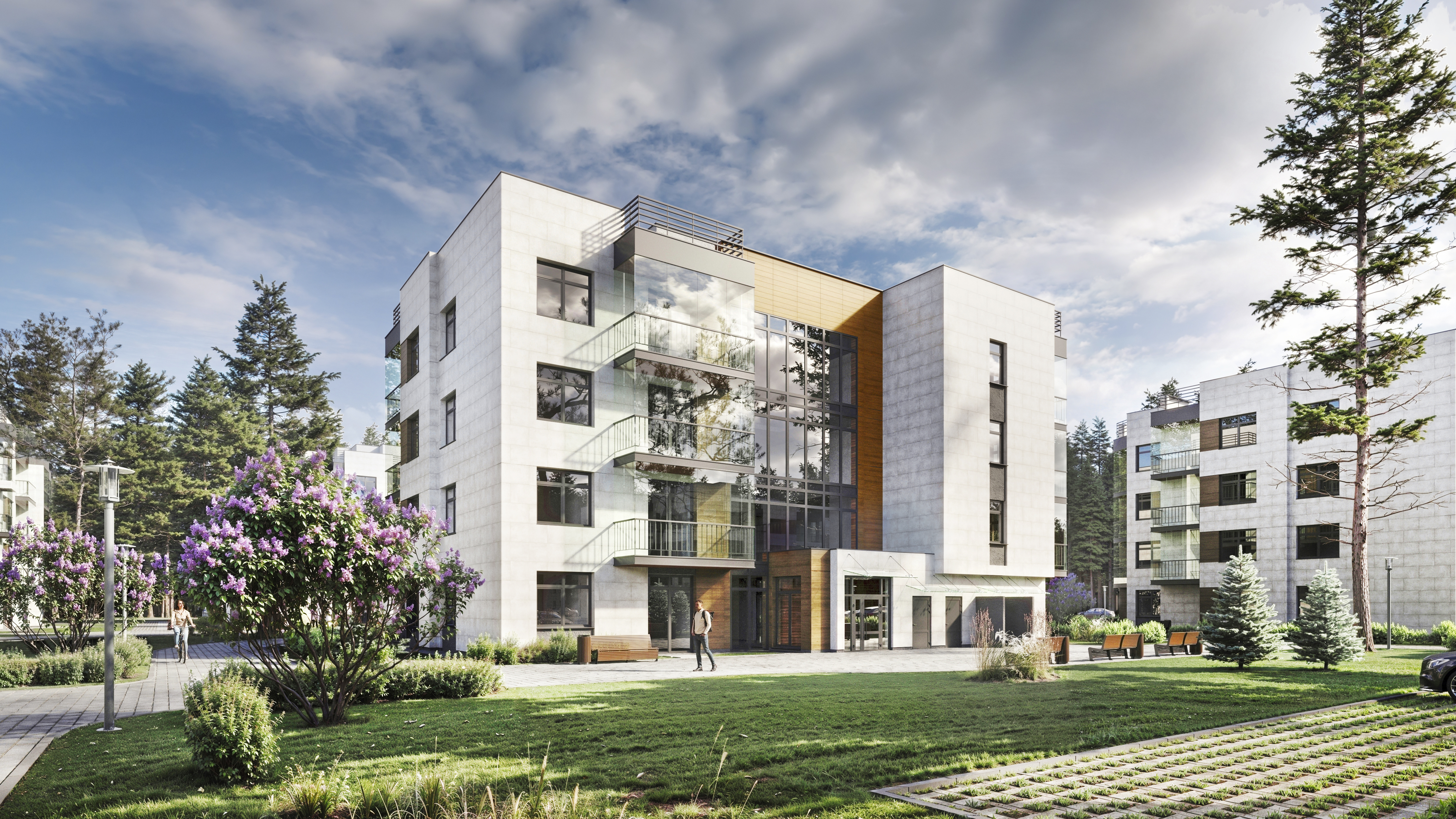 Выполнял моделирование и визуализацию квартала, а так же был придуман концепт МОПов в данном ЖК.