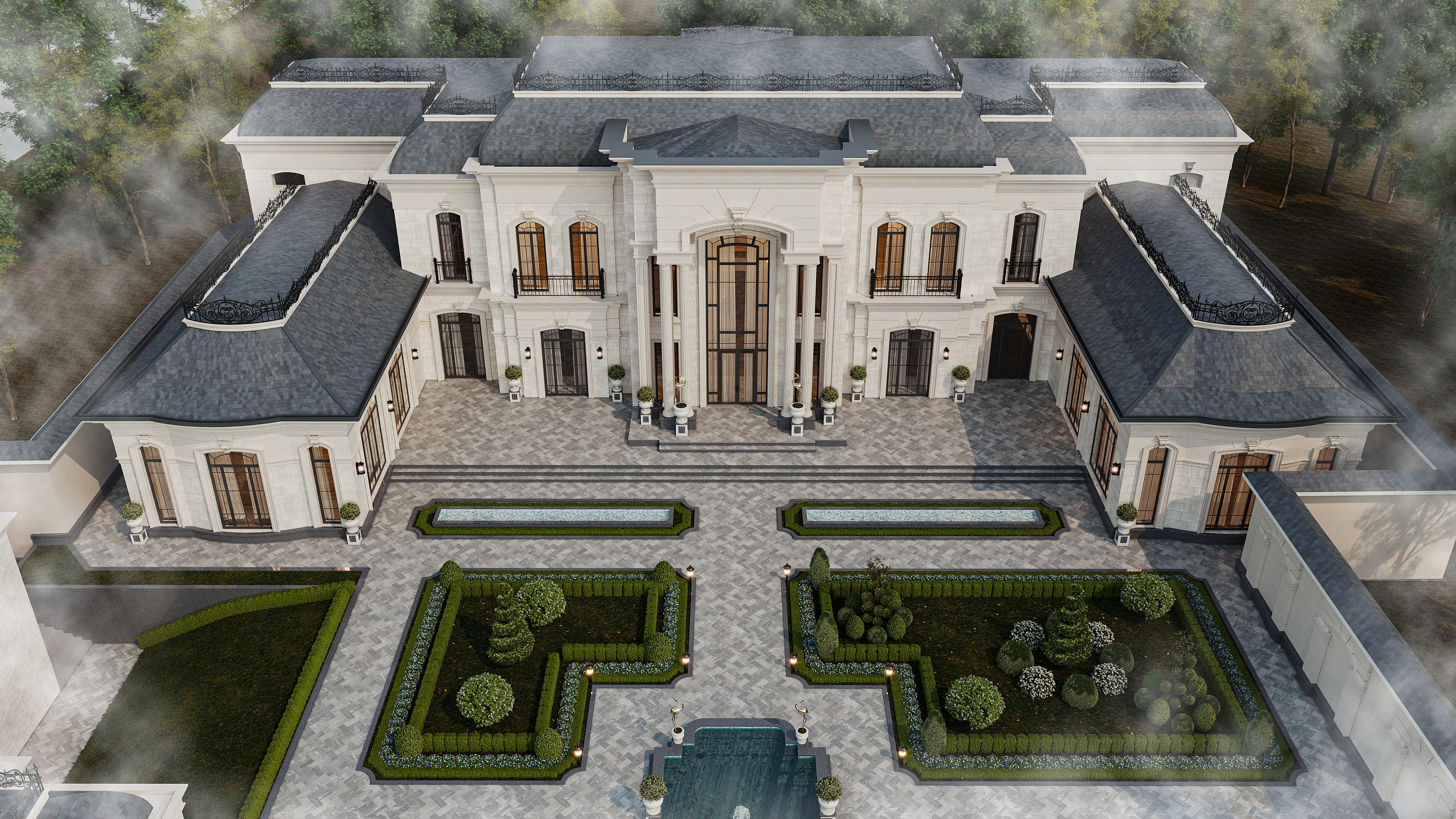 Этот проект выполнен в стиле классического неоклассицизма и представляет собой роскошную виллу, которая выделяется своей монументальной архитектурой и безупречной симметрией.