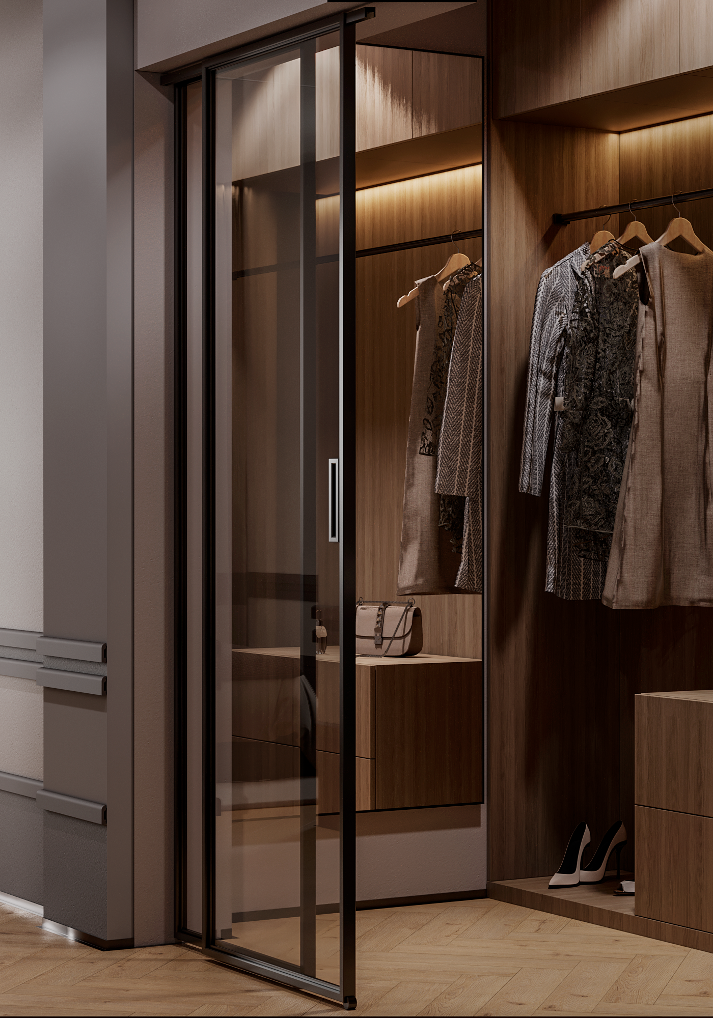 Визуализация спальни с гардеробной и санузлом
