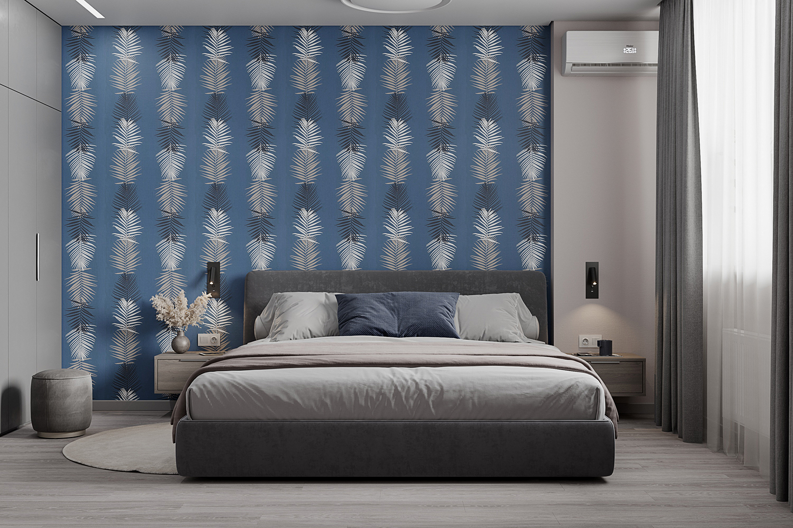 Минималистичная спальня в спокойных приглушенных тонах. Центром этой композиции служит акцентная стена в изголовье кровати с эффектными обоями, украшенными стилизованным принтом в виде пальмовых листьев. Глубокие оттенки синего сочетаются с нейтральной гаммой интерьера, придавая комнате одновременно свежесть и элегантность.