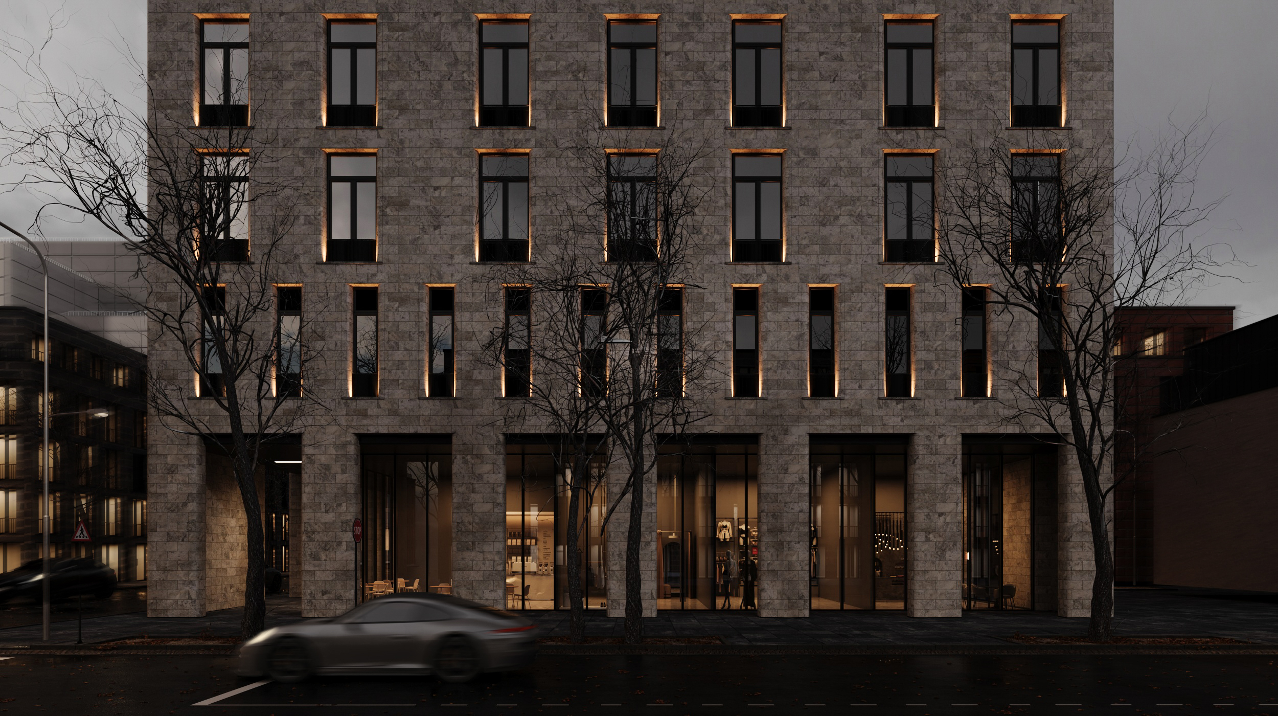 This project showcases a contemporary commercial building with a clean, minimalist aesthetic. The ground floor is designed for retail or hospitality use, featuring an inviting facade with warm integrated lighting that creates a welcoming evening ambiance.