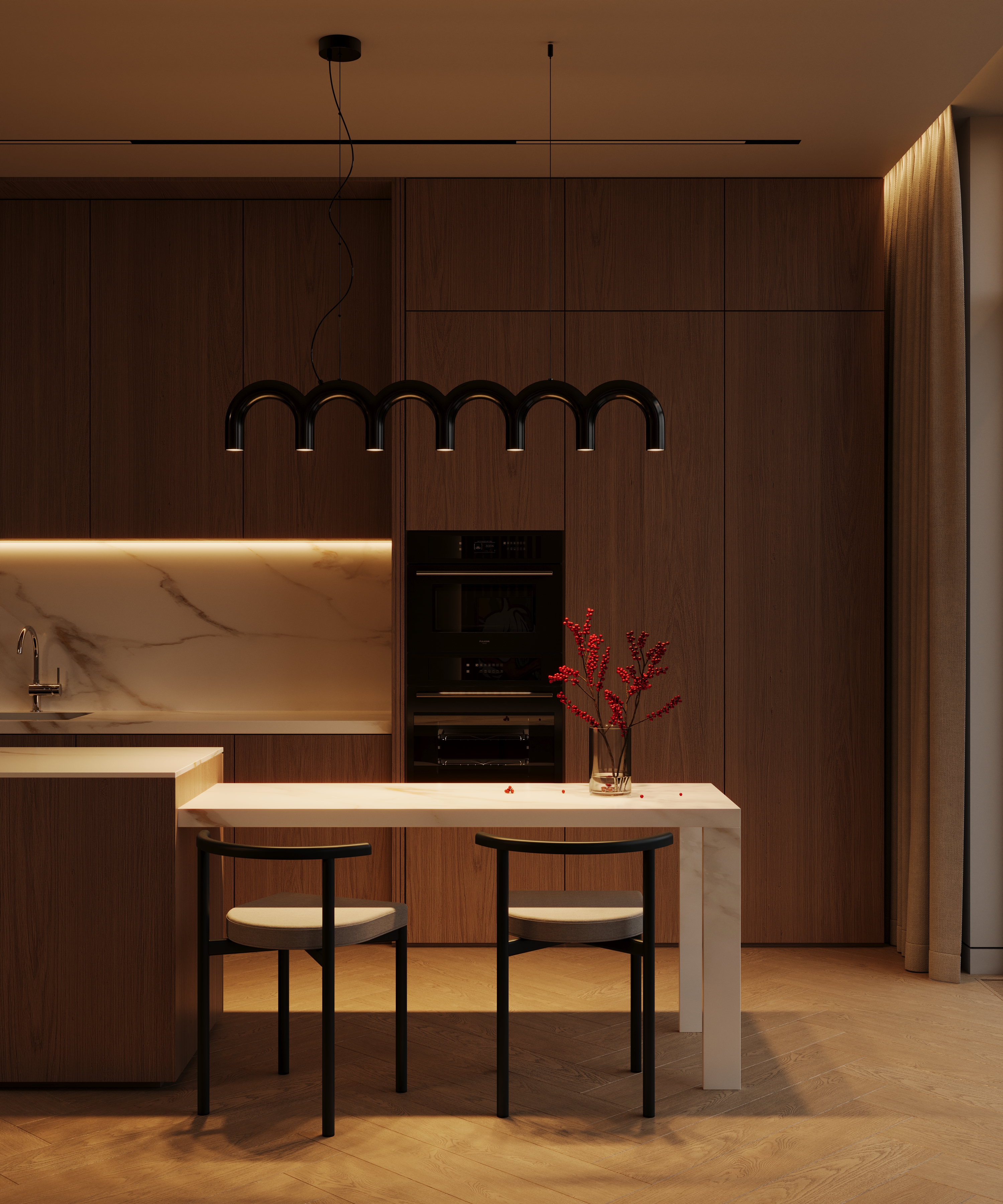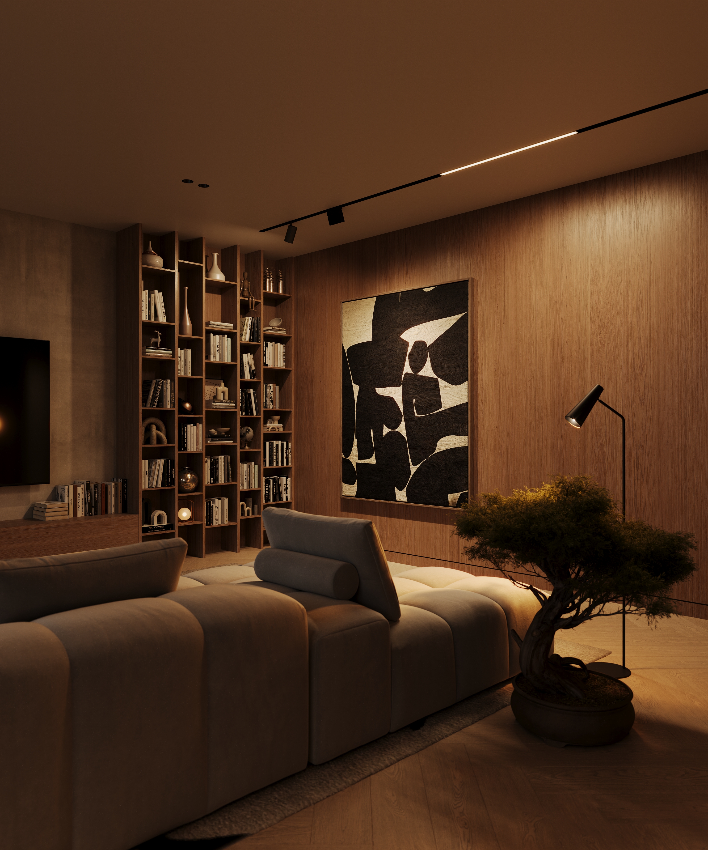 Тёплые оттенки дерева, мягкие текстуры и приглушённый свет создают атмосферу спокойствия и стиля. Лаконичная мебель, природные акценты и простор делают этот интерьер идеальным местом для отдыха и вдохновения