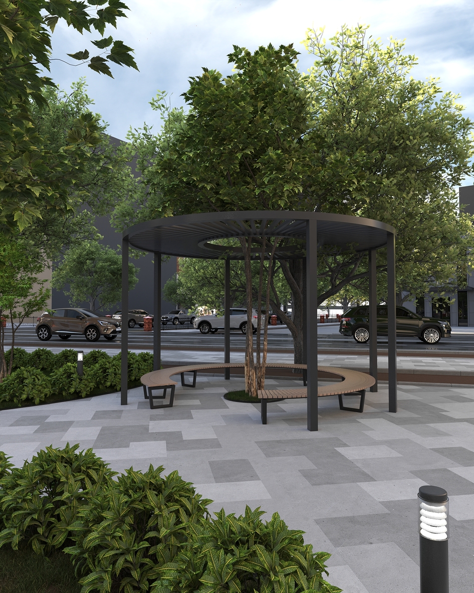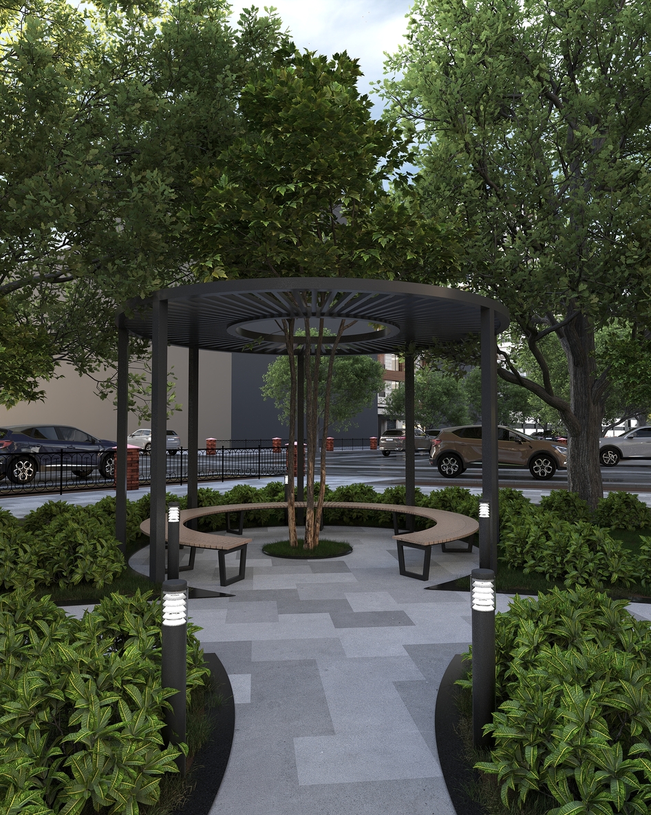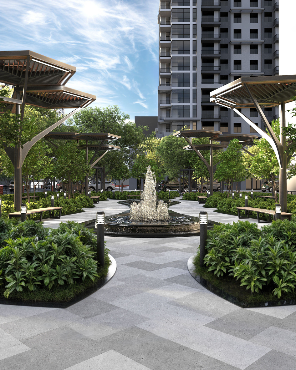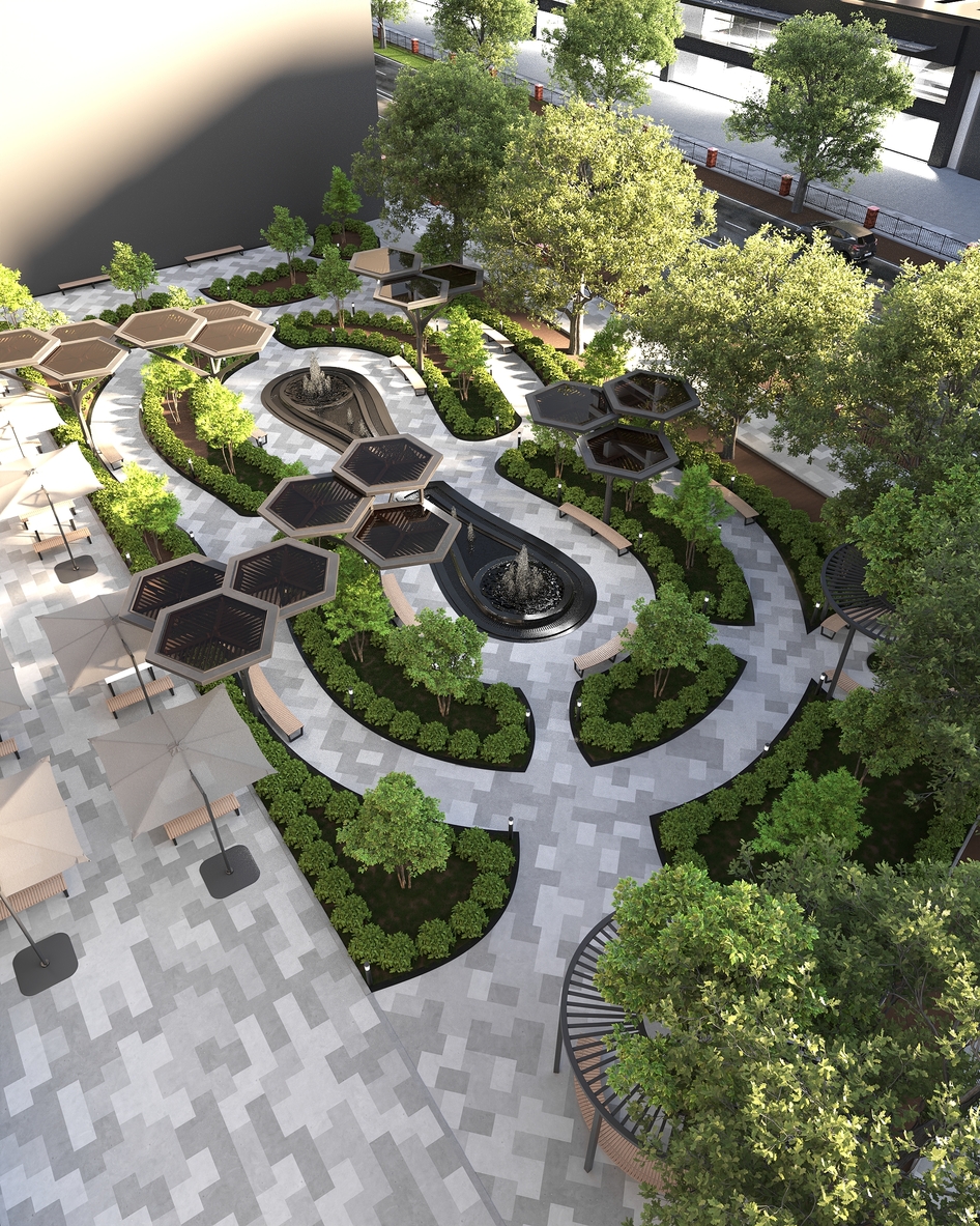 A stylish and modern public recreation area designed for relaxation and social gatherings. The space features a central water fountain surrounded by green landscaping, contemporary seating areas, and geometric paving patterns. Combining nature with urban aesthetics, this design provides a calm and elegant outdoor atmosphere perfect for city residents.